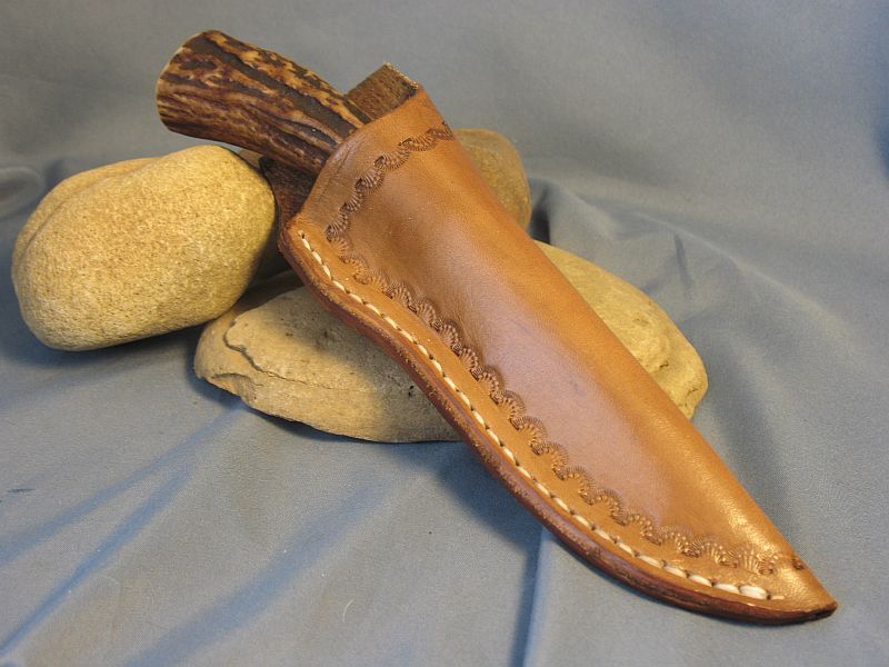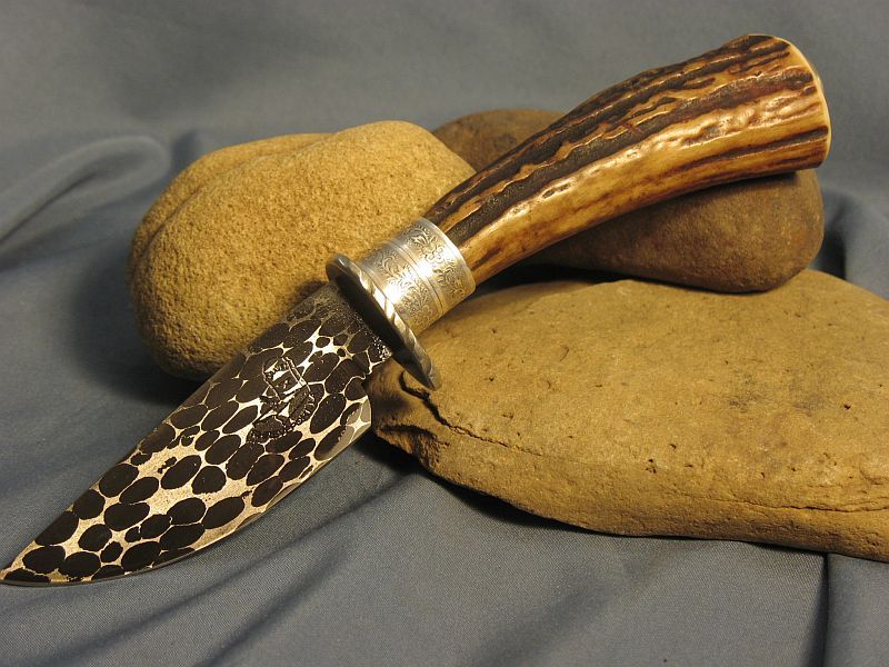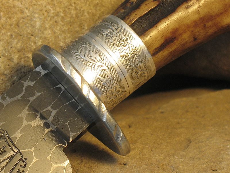 Hello folks. This is Sambar stag from India. Good for the right or left hand and very comfortable. Hope you like it and here are the specs. Fittings are nickel silver and butt cap is carved while guard is file worked and ferrule is sterling silver. Damascus I forged of 4800KC and 52100 to produce the pattern (Sharp and great edge retention). The blade measures 3 1/2 inches and overall is 8 inches. Is 1/4" thick at guard and taper to tip. sheath included. It is "SPF" and priority mail in USA is 6.00. My paypal and e-mail is dangraves4923@earthlink.net