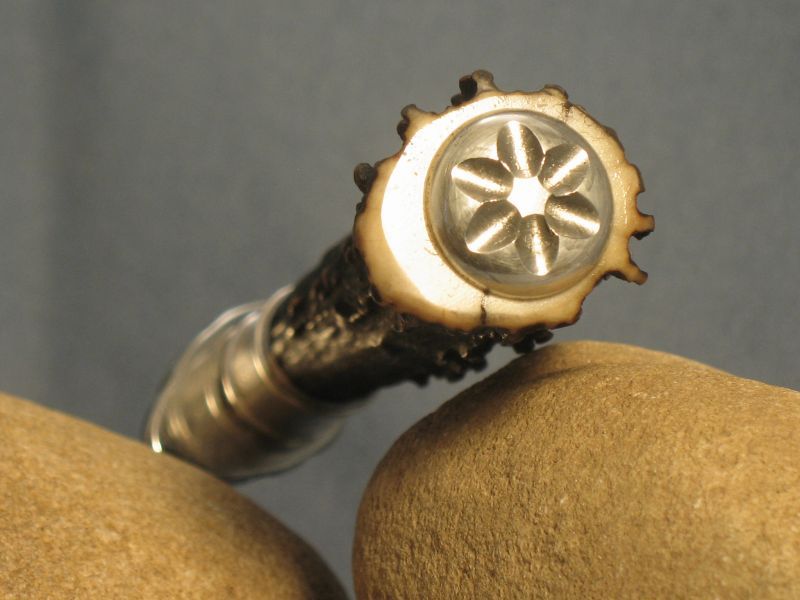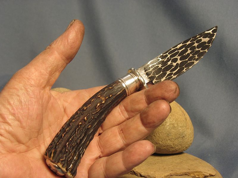 Hello folks. This is Sambar stag from India. Good for the right or left hand and very comfortable. Hope you like it and here are the specs. Fittings are nickel silver and butt cap is carved while guard is file worked and ferrule is sterling silver. Damascus I forged of 4800KC and 52100 to produce the pattern (Sharp and great edge retention). The blade measures 3 5/8 inches and overall is 7 3/4 inches. Is 3/16" thick at guard and taper to tip. sheath included. It is "SOLD SOLD" and priority mail in USA is 6.00. My paypal and e-mail is dangraves4923@earthlink.net