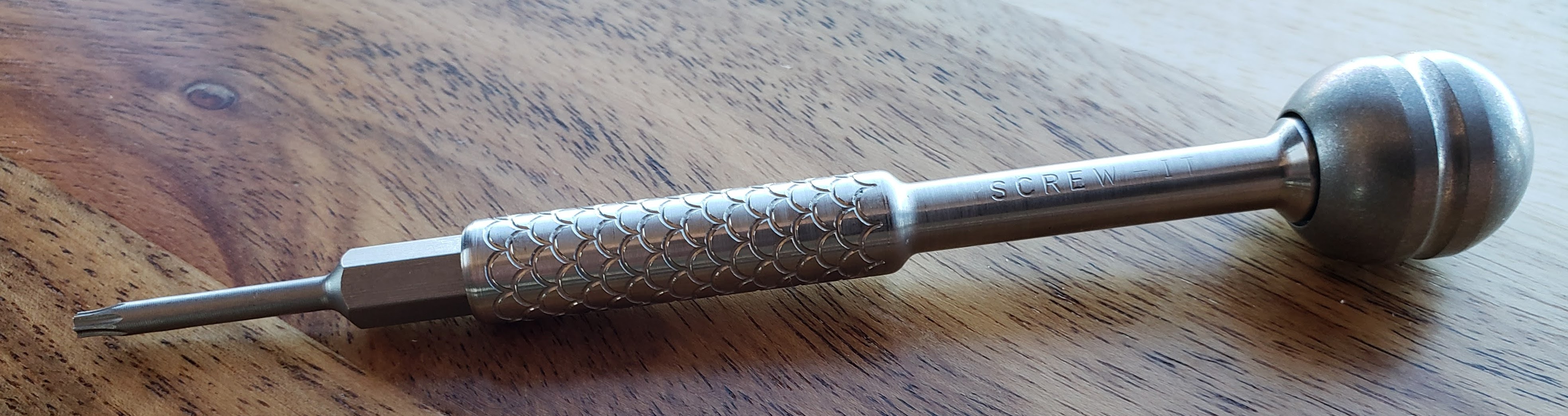 Steve Kelly's Ti Connector the Screw-It Precision Driver. This ¼" bit driver accepts all standard ¼" bits. The Screw-It comes equipped with and is designed for use with Wiha Power Bits and includes 4 Torx Bits: T6, T8, T10 and T15. The body of the driver is solid 6AL4V Titanium precision machined with fish scale texture for a secure grip. The ball is made of tumbled titanium and, equipped with hi grade bearing, allow for smooth and effortless operation whether as a driver or fidget spinner. The ball is unique in that it is attached via a titanium screw making it fully removable for servicing or replacement.