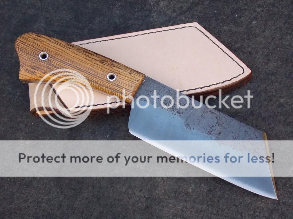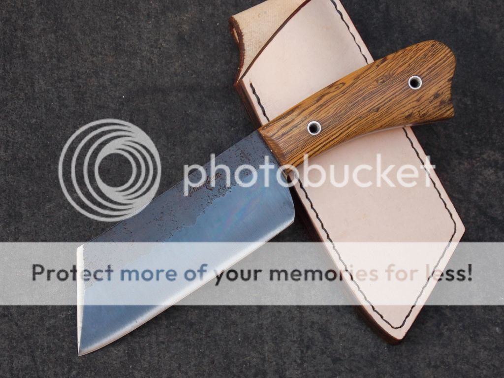 I have small pieces left over from time to time and they dont go to waste, forged from 3/8ths aldo 1095fg, bocote handle, stainless pins, forge texture left on top of the blade,hot browned and gun blued finish,sharp, sharp, damn sharp! price shipped paypal is 130.00 paypal address is c.edmondsonknives@yahoo.com, I have 5 like this on the finishing table. not exactly the same but in this style if anyones interested in one, thanks to all, Charlie Edmondson