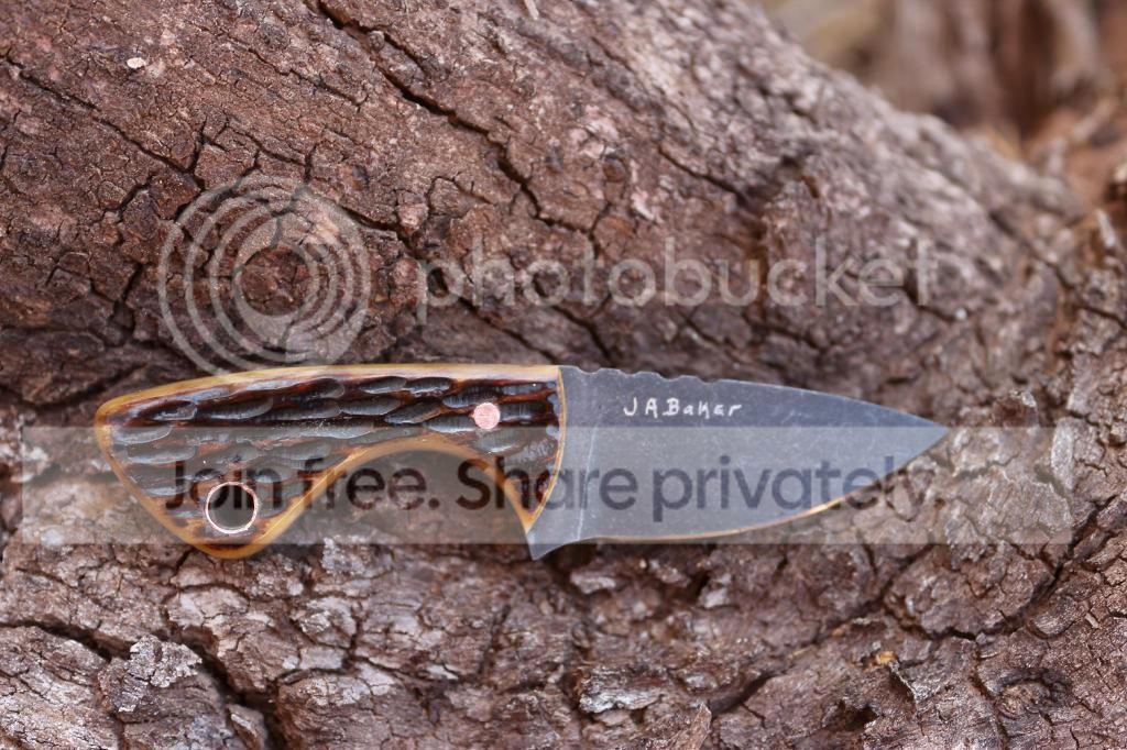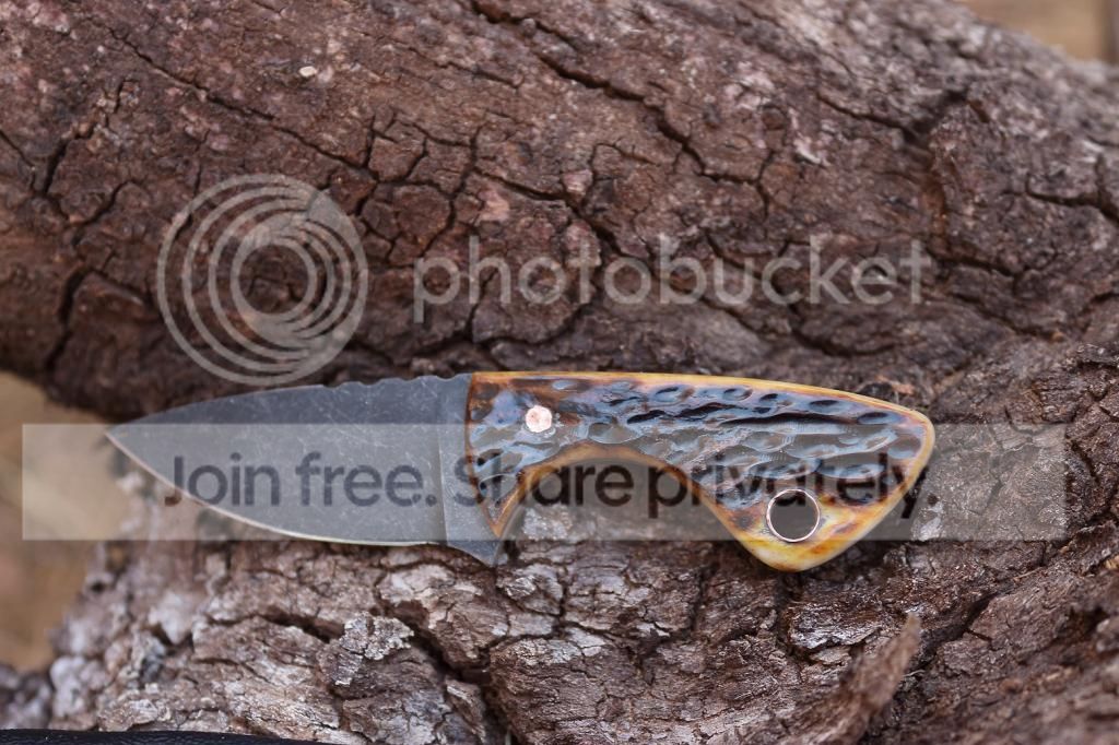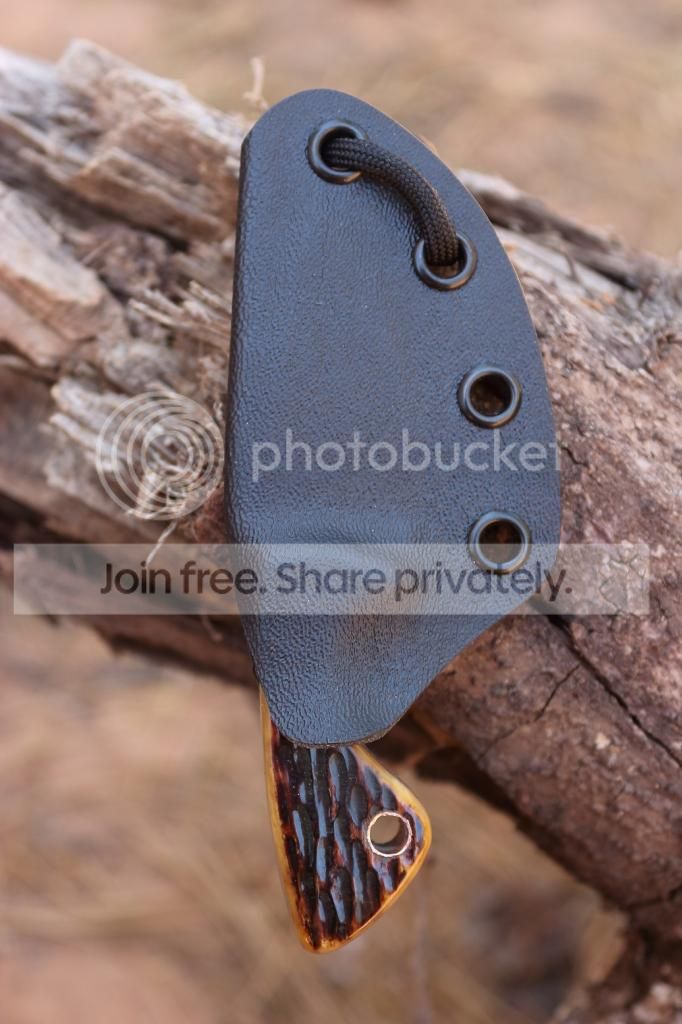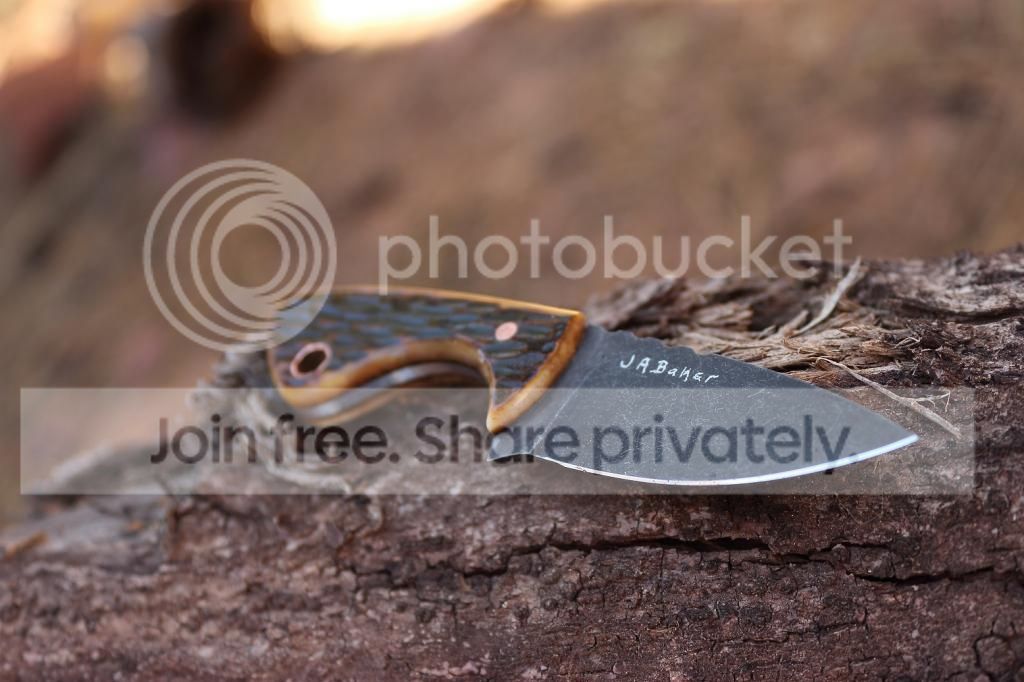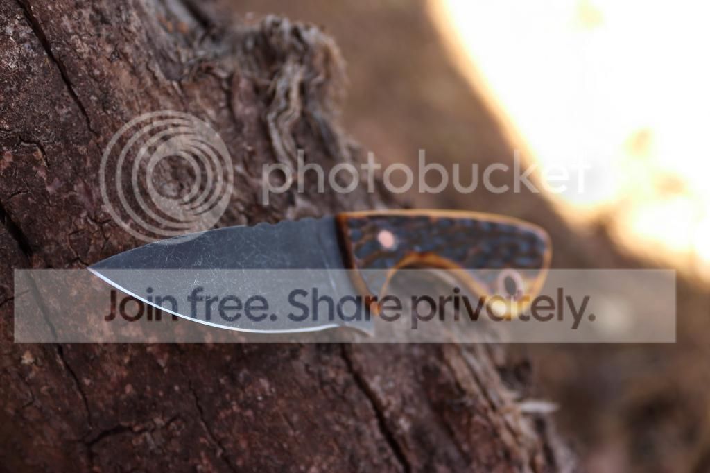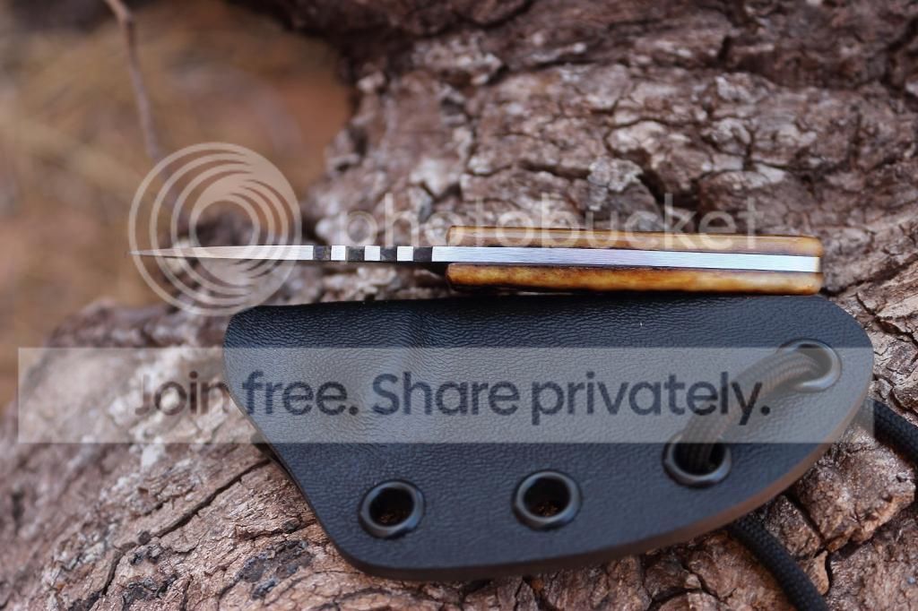 I just finished up this little necker. It has a stonewashed 1095 blade that has been hardened to 59RC. It has jigged bone scales with textured copper pins. This one comes with a black Kydex sheath with black paracord lanyard. Thank you for looking, Jeff