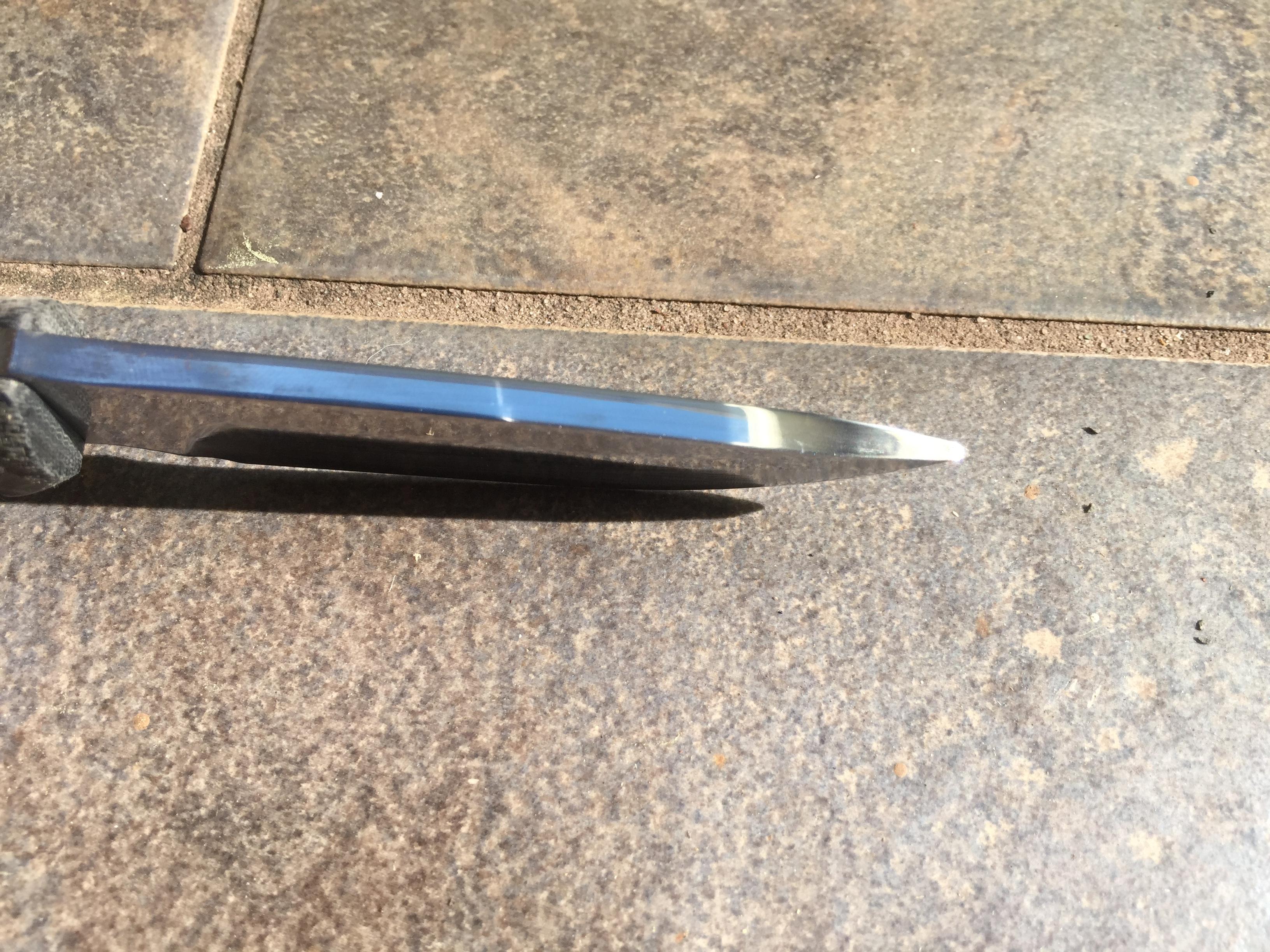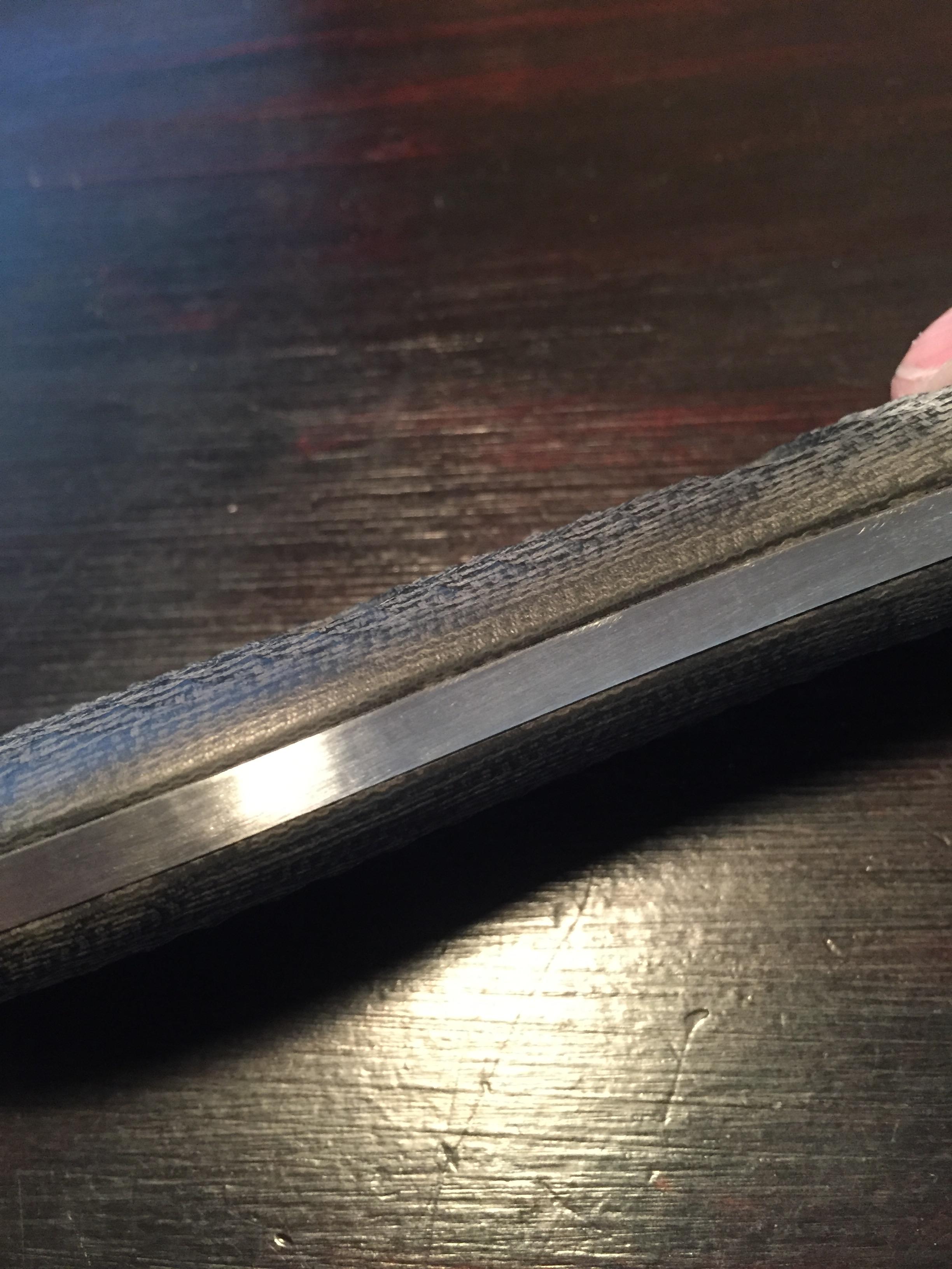 The AD came to me sharpened from a previous owner with a decent edge but the bevel was very wide. The SR-101 AD is a very thick blade from spine to cutting edge and still very thick behind cutting edge which is why the bevel is so wide. I am waiting on some finishing stones and sanding tools to come in the mail to thin the edge out and get the AD to where it will be a nice slicer and great all around blade but in the mean time that is the last step for the AD.