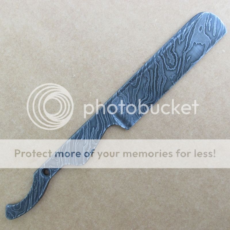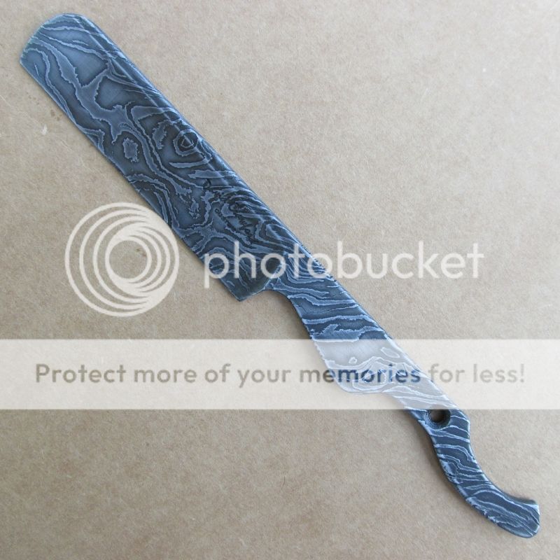 Here's a little blade just finished that I hope someone will enjoy. It's made from my own Twist Damascus in 1084 & 15n20. This is my first razor type blade and since I'm sure there's a complete science to grinding razors (and I haven't studied it) I'm offering this as a desk knife. It's 6 3/4" long with a 3" cutting edge, is 1/8" thick, has jimping on top & bottom of handle and is hollow ground to a zero edge.