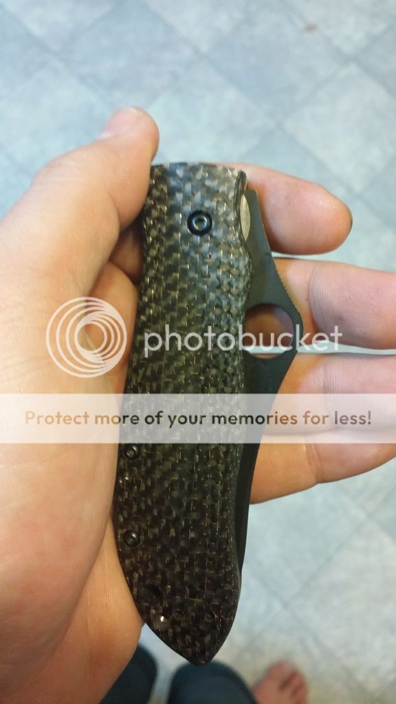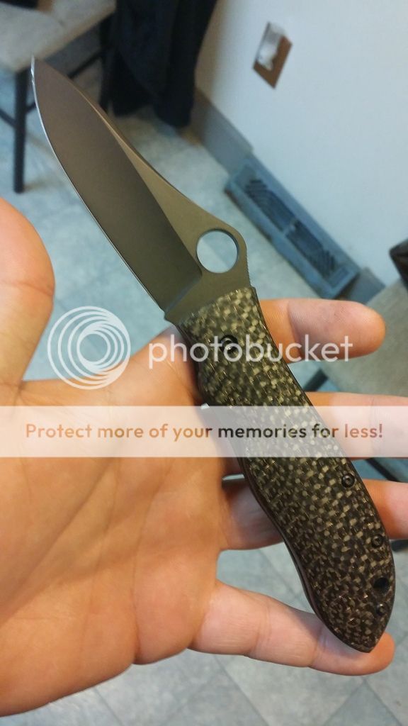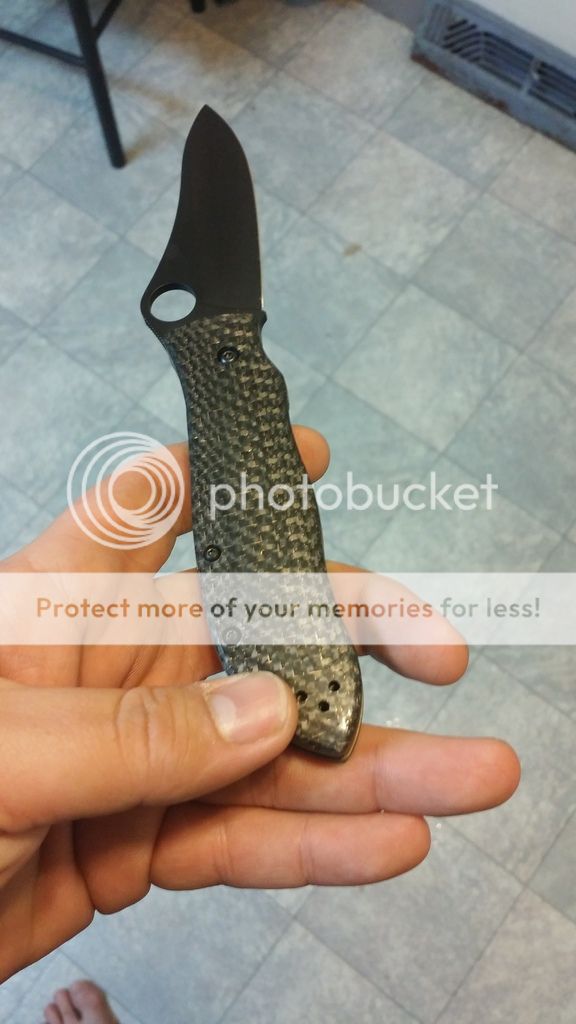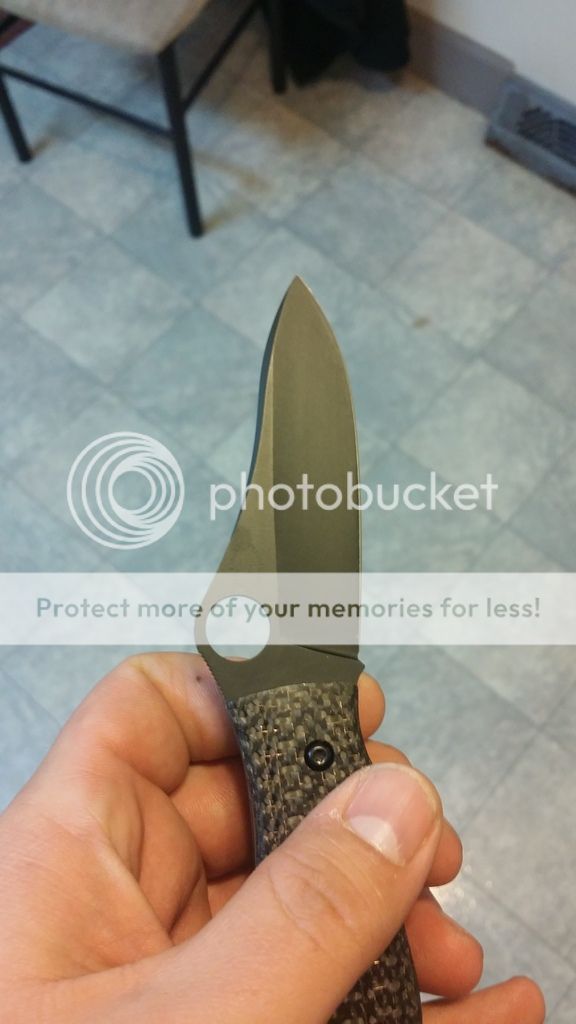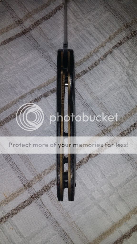 Gayle Bradley regrind nice and thin to be a great slicer had the blade and standoffs cerakoted Black and the scales a bronze to match the contoured lightning strike carbon fiber scales. Has original scales and box as well. I have a good amount in this knife. Had been uses to cut some stuff but still in good shape. The coating still looks good. The only thing when the blade is closed on one side you can see a little bit of the metal that I think the tape was a little to high. It is minor bUT you can see. ...Will come with the deep carry clip only $sold