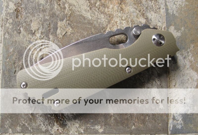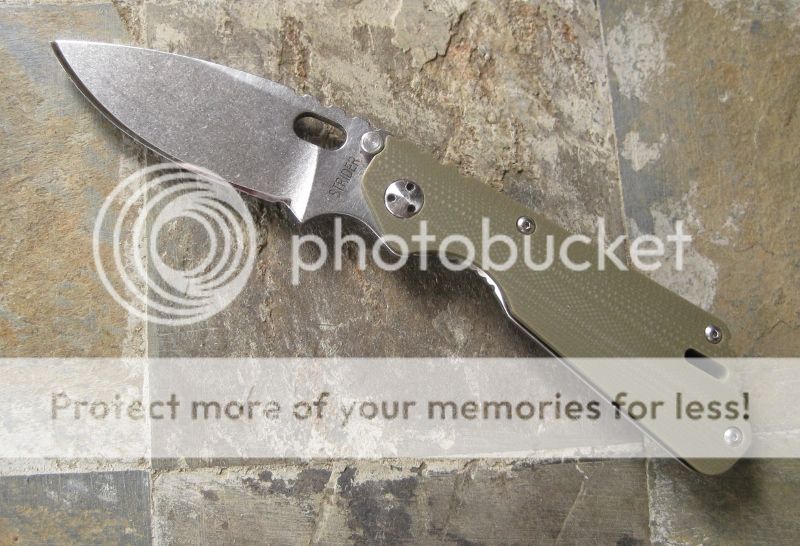 This is a lightly used Strider PT Concealed Carry. There are some light scratches on the blade & frame from pocket wear and light usage. I did my best to make the scratches as visible as possible in the pictures. The scratches could be minimized or removed with Simichrome if one cares enough to fool with it. It is a great carry knife with solid lock-up & no blade play. It has a stonewashed titanium frame; smooth, contoured green G10 scales; stone-washed, 2.75" S30V drop-point blade; dual thumb studs & oval cutout; lanyard hole; 6.5" OAL.