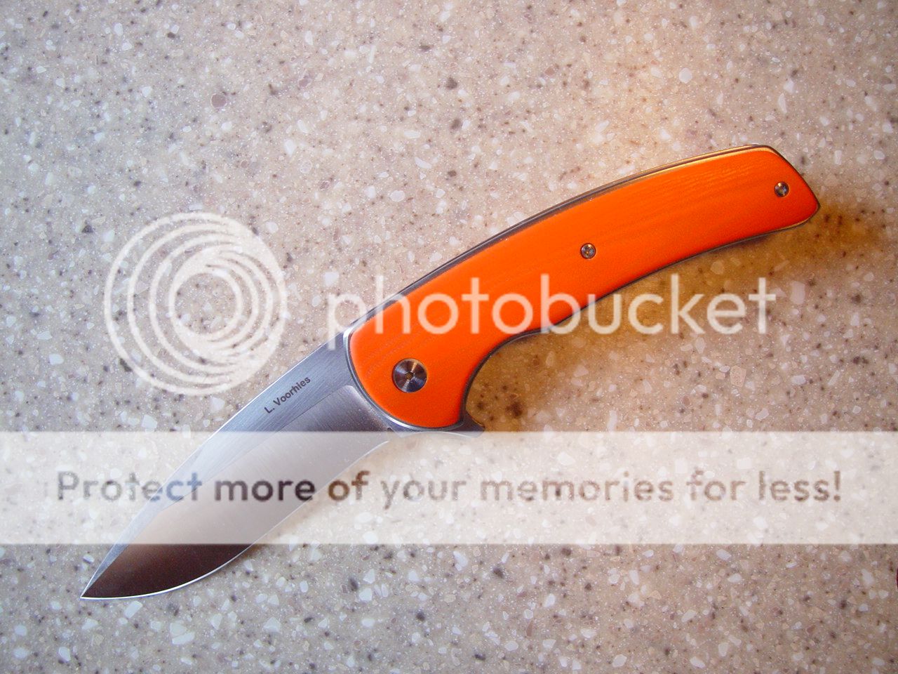 A Les Voorhies Model 11, I believe, 4" blade, has been used and has a tiny nick in the blade, I think it would come out after the first sharpening, overall great shape beside the nick, $550