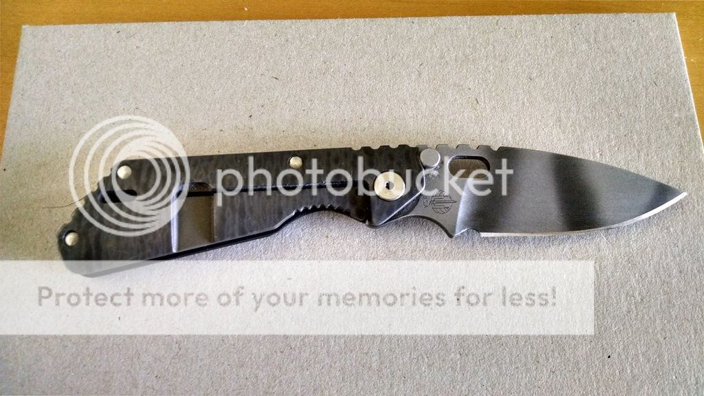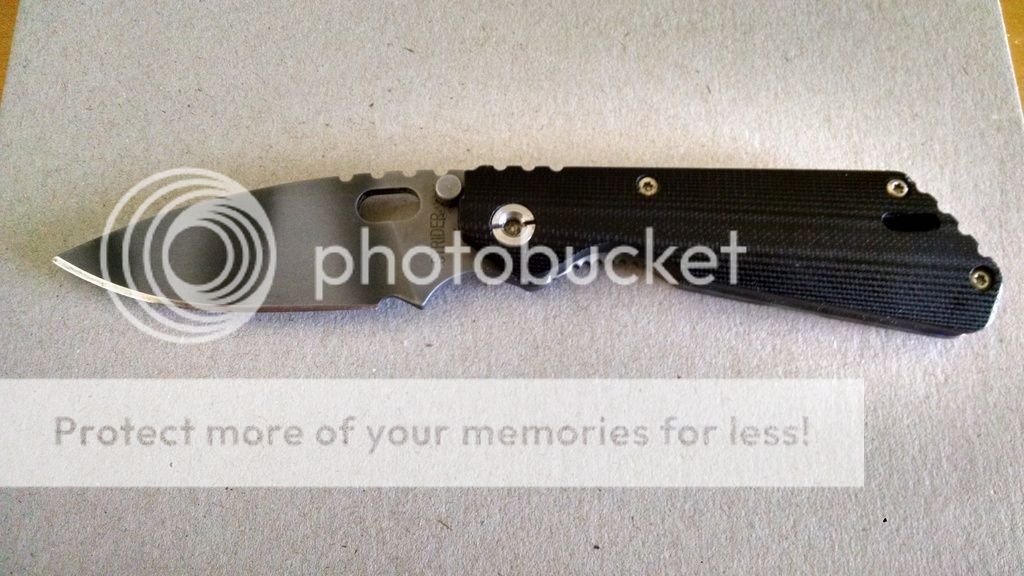 First up is a Strider PT CC - Black G10, Flamed Ti, Tiger Stripe Blade. Pretty sure the steel is S30v. This is a user, but in great shape. Some markings on the Flamed Ti, but no deep scratches/damage. Blade, and G10 is in great shape, with little to no wear - blade has been sharpened on Wicked Edge to mirror finish. Lockup is strong with no movement, and strong snappy detent. Really a great little knife in a hard to find configuration. Excuse the pocket lint in the pics...