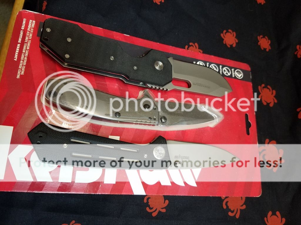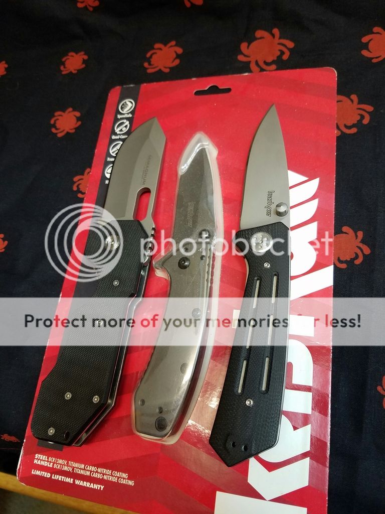 Package of three knives. A new Kershaw Cryo, a used Kershaw Injection 3.5, and a Magnum by Boker. I've sharpened both the Boker and Injection on my wicked edge, and have lightly used the Injection (maybe cut some food one time). The only issue I see with the Boker is if you flick it open hard it'll lock up all the way but is fine otherwise. $50 for all three shipped