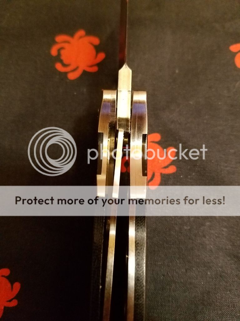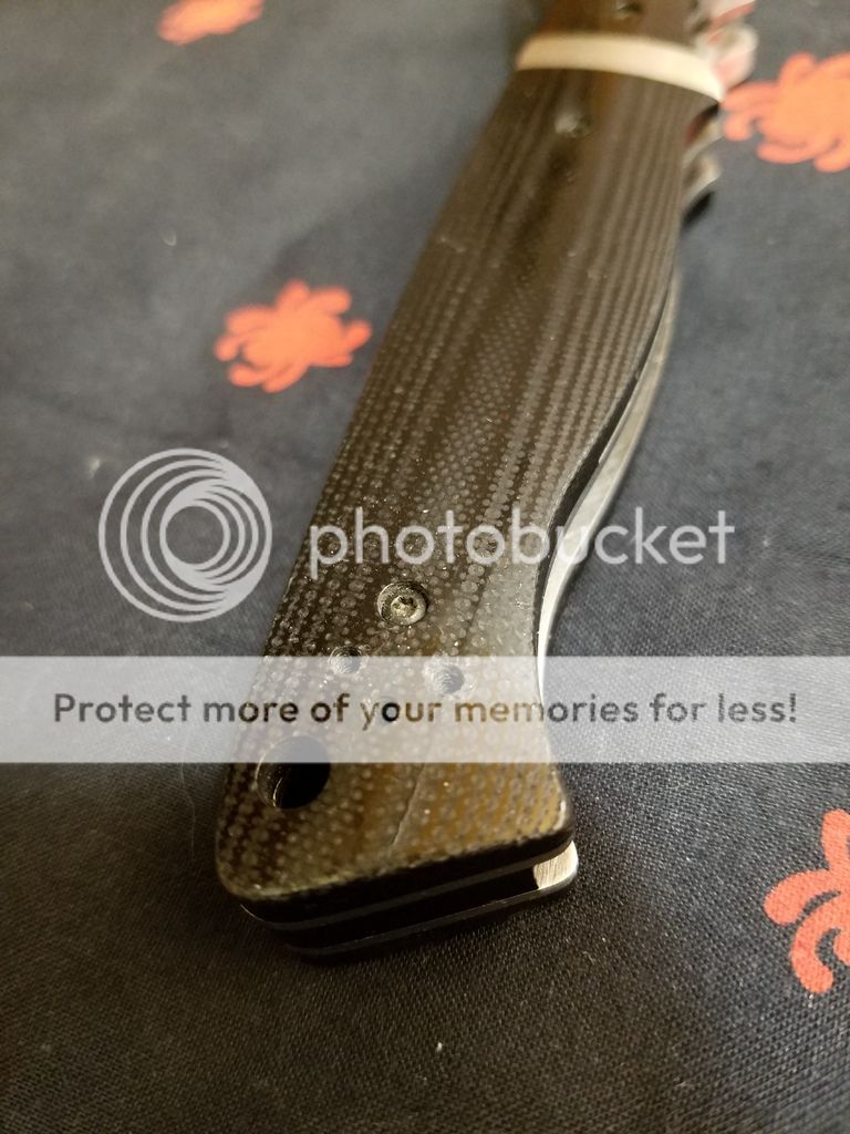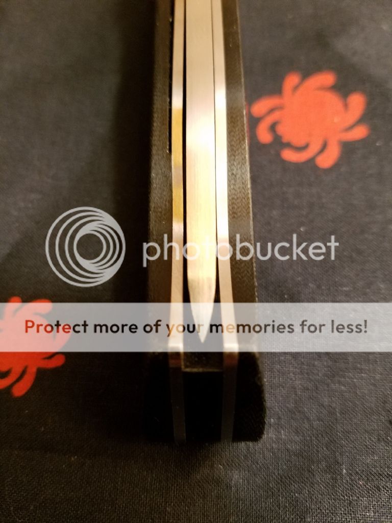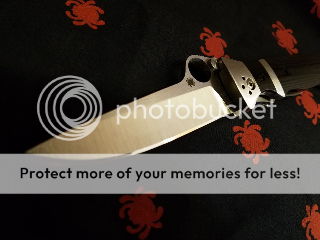 Next is a Spyderco Vallotton. I bought this used on the forum and the previous owner stripped the right hand tip up (possibly more?) holes so the stock clip and screws won't work. The bolsters have scratches. This knife is being sold with no clip and would work great for someone who prefers lanyards. It has been sharpened on my wicked edge but again, rarely, if ever used by me. Very smooth, perfectly centered. $120