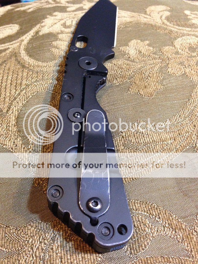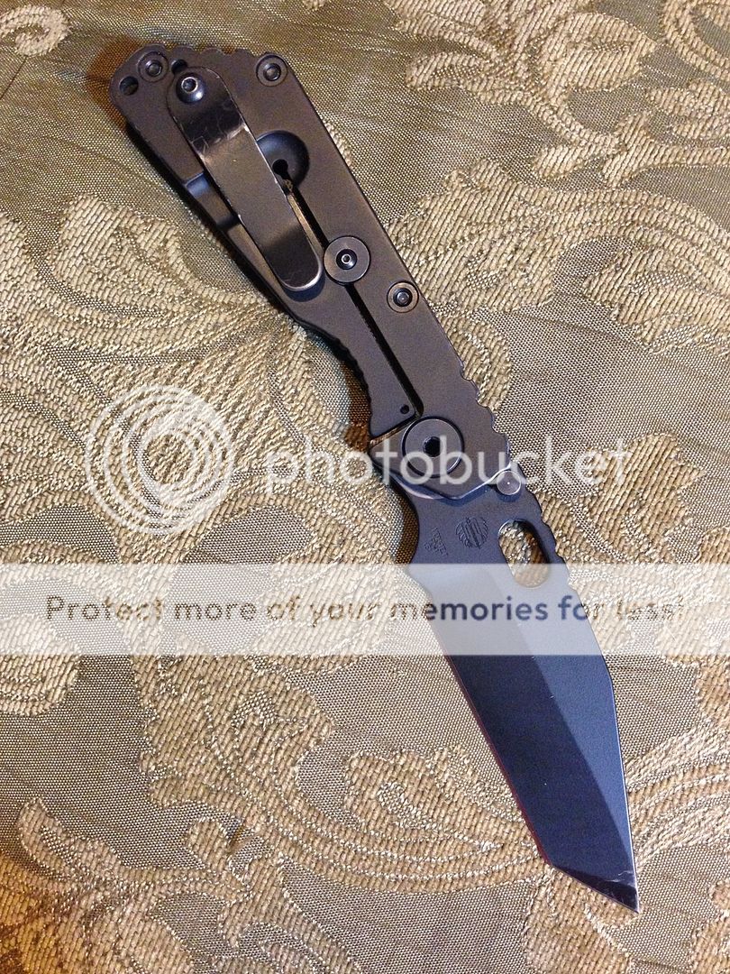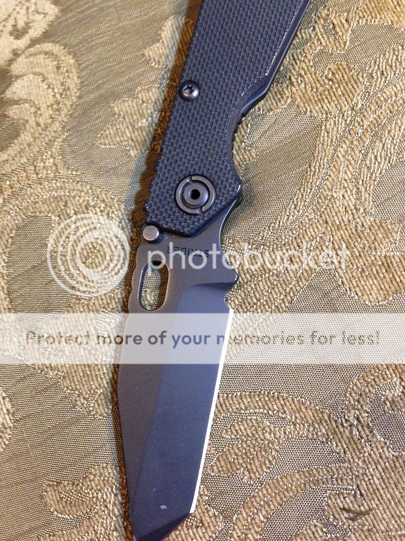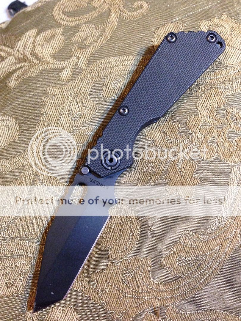 1 - dropped - lowest price $290- don't offer any lower!! Strider Sng Tanto - micro melt pd#1 steel (pd1.. Oh yeah baby!) as you can see it's been carried and shows it. Just got it back from strider , had a full tune up. New washers and hardware, made the lock up earlier, then they sharpened it up. It's paper slicing sharp ready to go! Solid and early lock up. You can adjust the pivot without the special tool and it hasn't come loose on me yet. I have it set a tad loose (you can muscle a tad of blade play) but it's nice and flickable. Again you can adjust it easily and it's still nice and smooth, just not quite as flickable.. and then it will lock up like a fixed blade. Nicely centered. No box (striders don't come with boxes, I do have the zip lock bag though!)