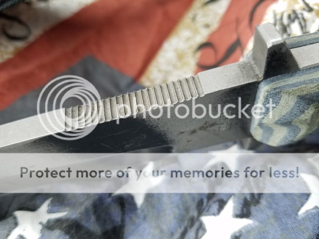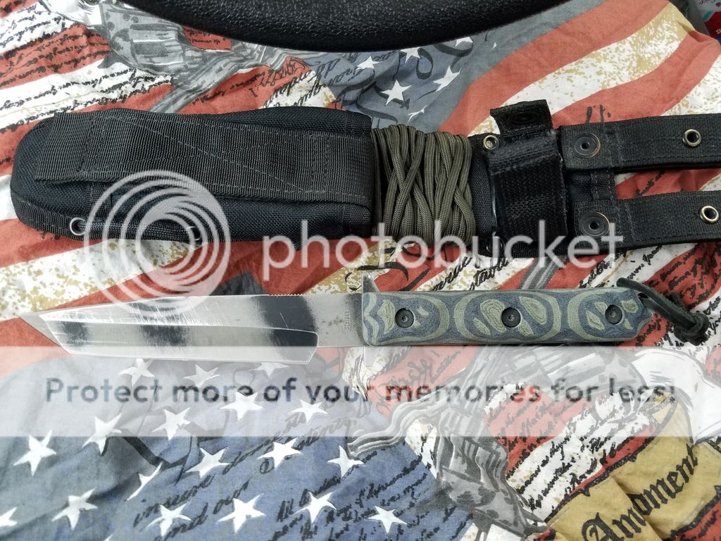 This is a gen 1 WB with the fine jimping. Was spray paint tiger-striped, came cord wrapped but I made some black and green micarta for it and used hex bolts from Monkey Edge to attach. .25" BOS S30v. This knife is serial numbered under the handles. Comes with a very used Spec Ops sheath also. Asking $225 shipped PayPal FF Conus. Yes I am open to trades. Really need some 37mm reloading supplies.