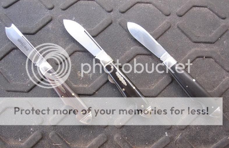 L to R; Coffeehouse acrylic, Goldenrod micarta, Antique yellow jigged bone easy open