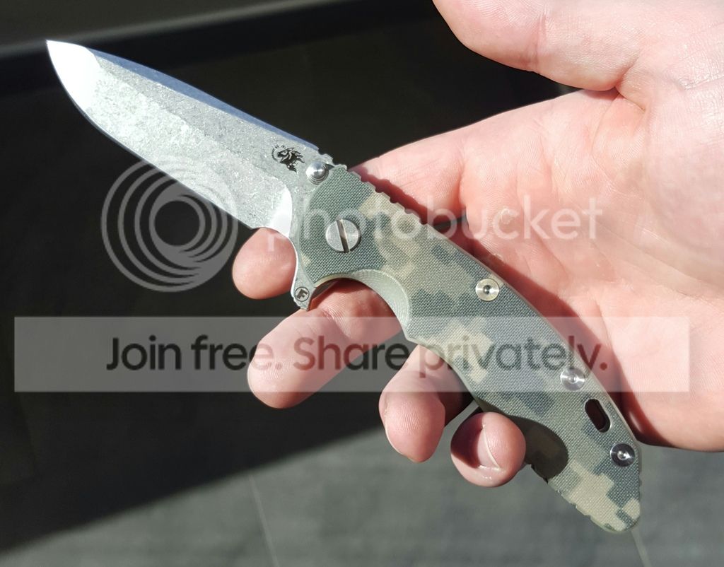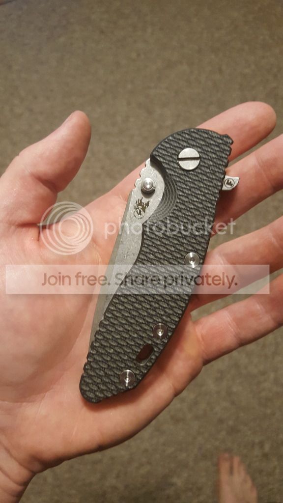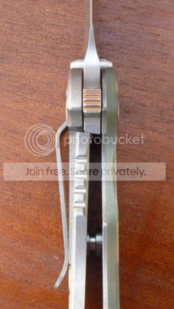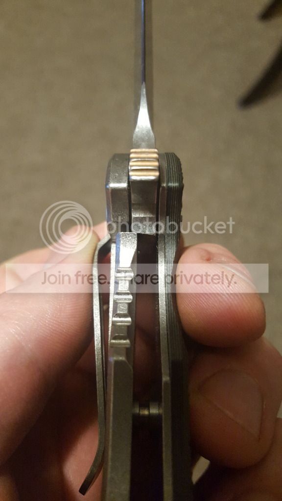 I was skeptical at first. I tried applying force to the spine to see if it would fail. It didnt. Then I thought "maybe its just tight? Maybe itll break back into its original lock up position?" So I flipped it... and flipped it... and flipped it. Maybe 200 times since I did this last night. Same lock up. Looks like 15% or so. Im SUPER happy, but i have no idea exactly which step caused this. On a side note, the action is still buttery smooth. The blade easily falls under its own weight and rockets out with either the light switch or push button method. Detent is perfectly medium. Blade is 100% perfectly centered. Anyone have any ideas? I know its been mentioned somewhere here on the forums that this is possible, but there were never any details that I could find. Any help would be appreciated as I would very much like to be able to replicate this on other Hinderers.