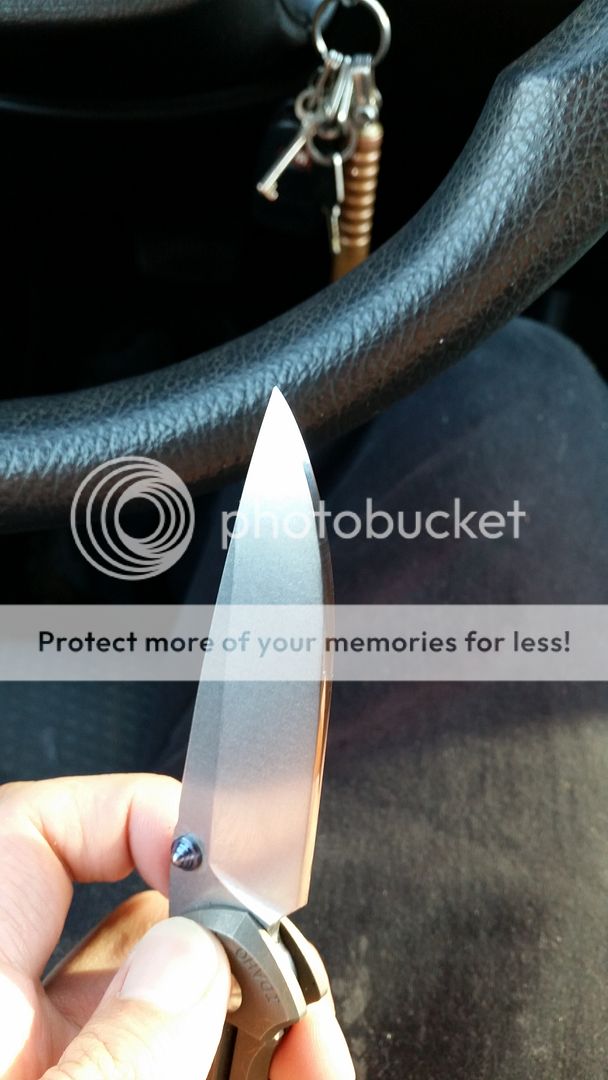 Here's one that I put a jeweled edge on. Unfortunately another bad pic, you can only see the edge where my micro keychain light hit. But it gives you an idea of how the edge looks. In actual daylight, my edges that are done like this sparkle like a blade length diamond.