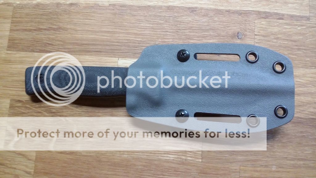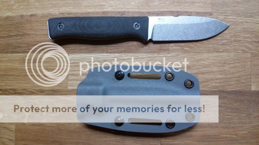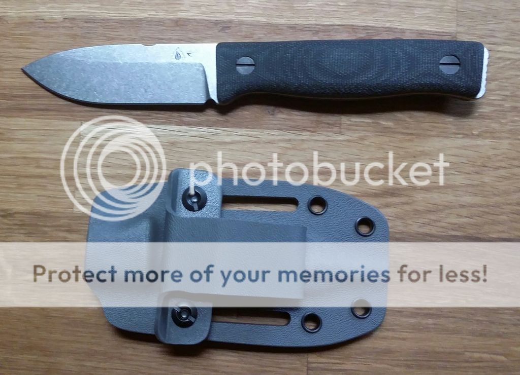 The scales are black micarta and the sheath is grey, slick looking combo. This version of the 3.5 is no longer available so get it while you can.