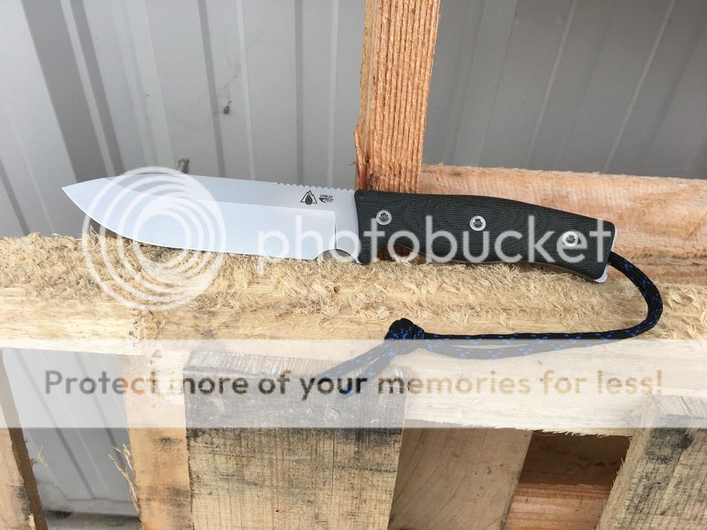 Used but not abused GSO new model 5.1 black micarta handle scales and kydex. Was only used for a few camping trips. Knife could use a sharpening but has a great working edge. This was not a factory second. Few marks here and there, blade has small nic in edge(tried to show in pics) not sure how that happened. Discounted price, all she needs is sharpened. Was going to keep but trying to gather funds for my new baby girl on the way. Price is pay pal goods (you pay fee or friends) only please. Will ship USPS priority. Email is best way to reach me. Thanks!