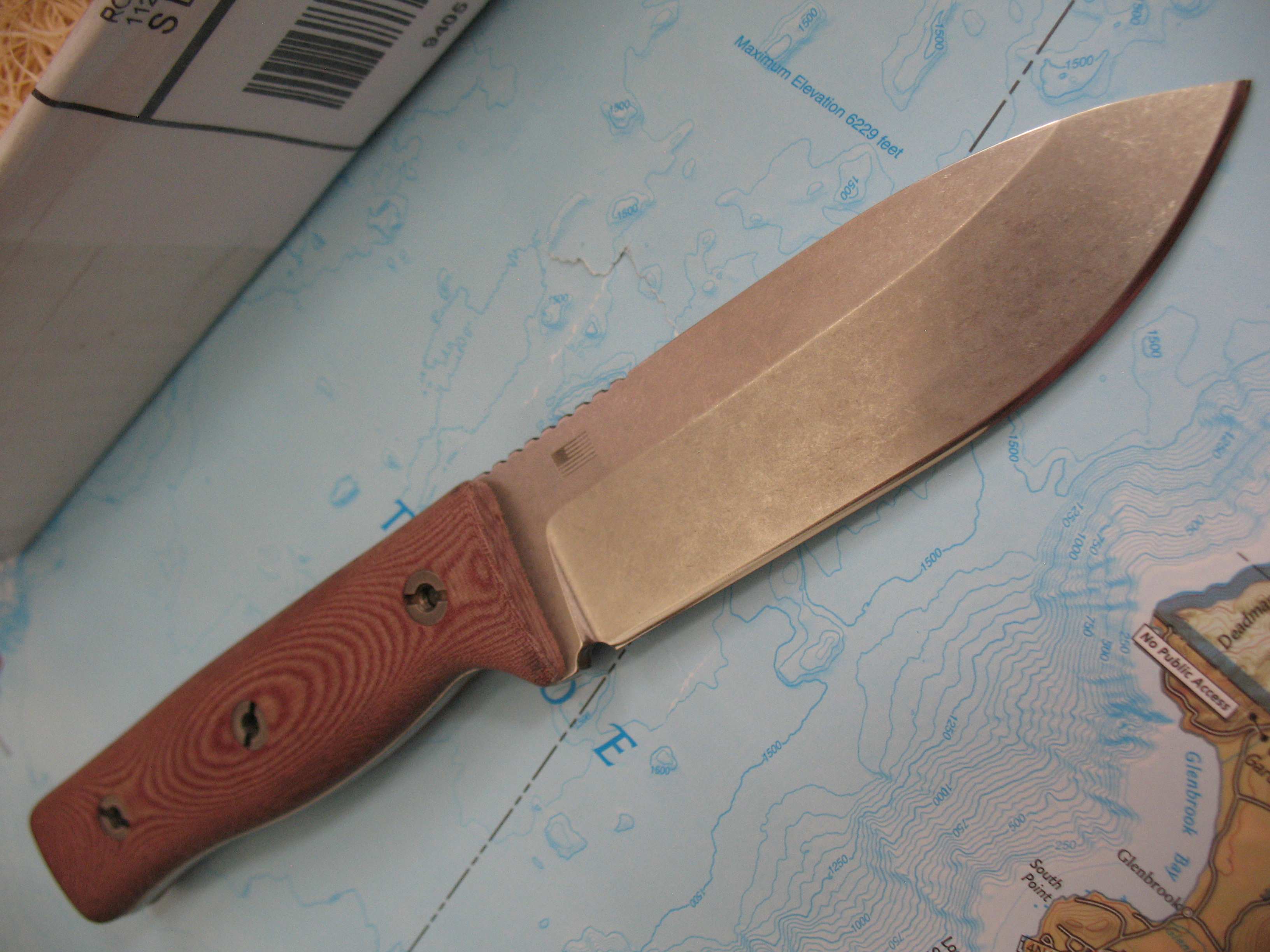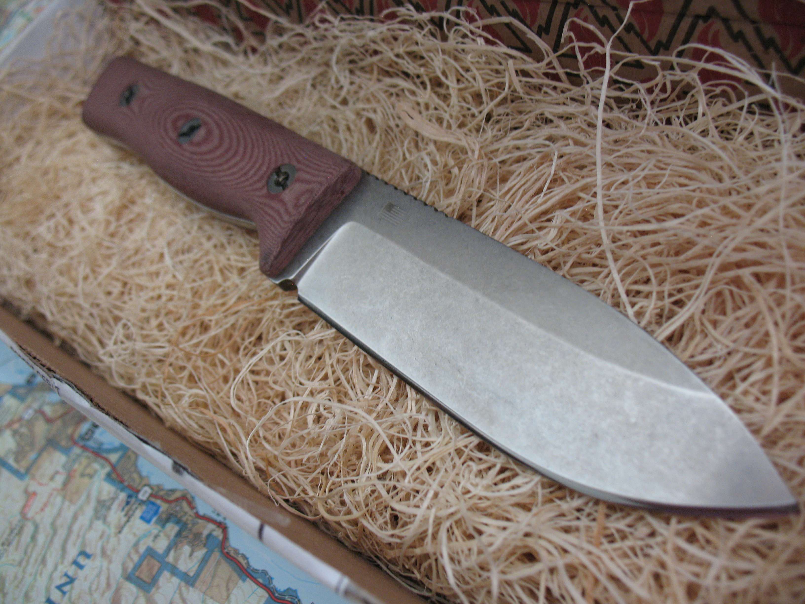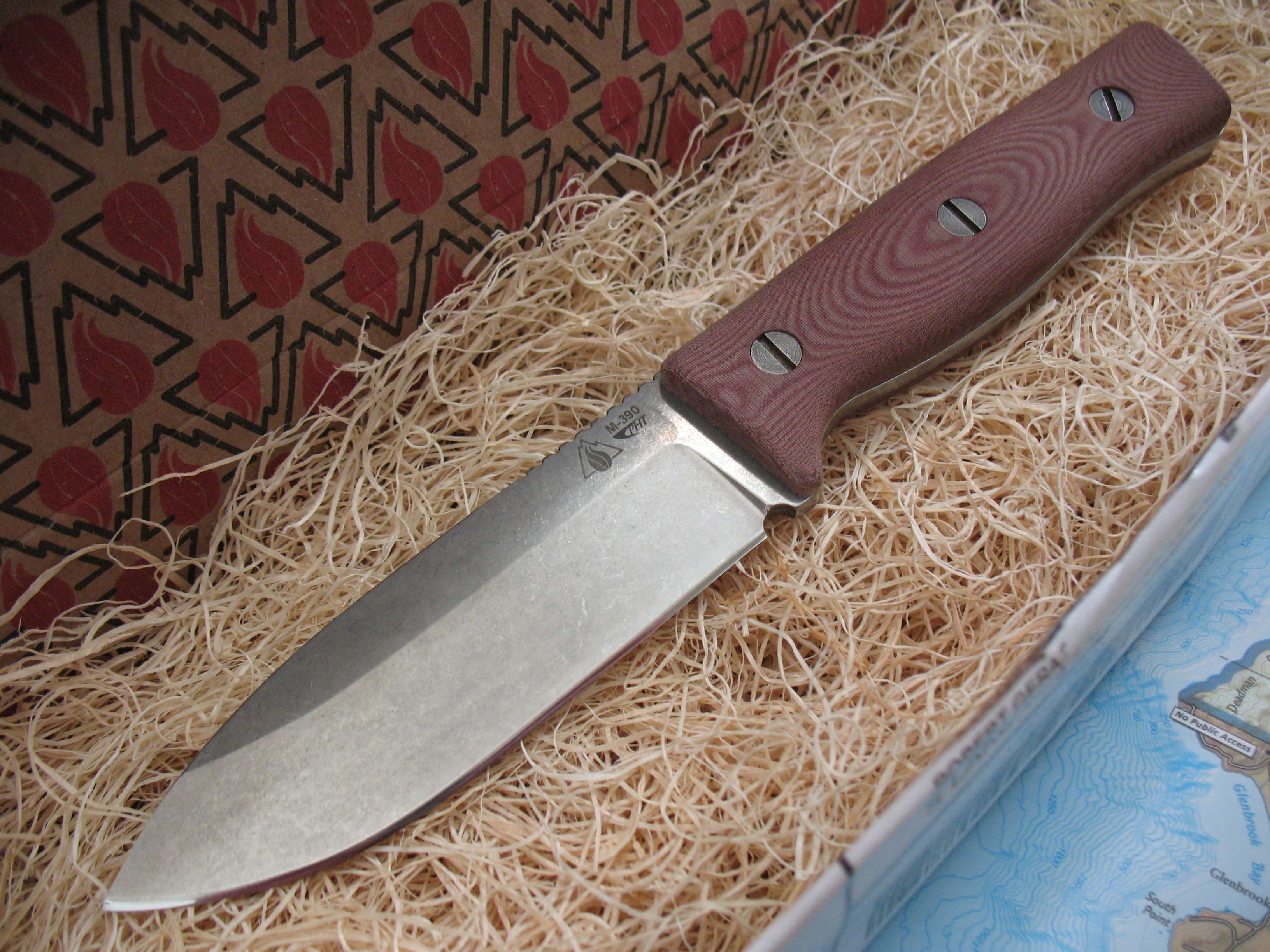 For sale is my Old Spec GSO 4.1 in M390 steel. This remains unused with the original edge. Tumbled finish shows a mark here and there as seen in the pictures. Red linen micarta handles with an FDE sheath. Box is included.