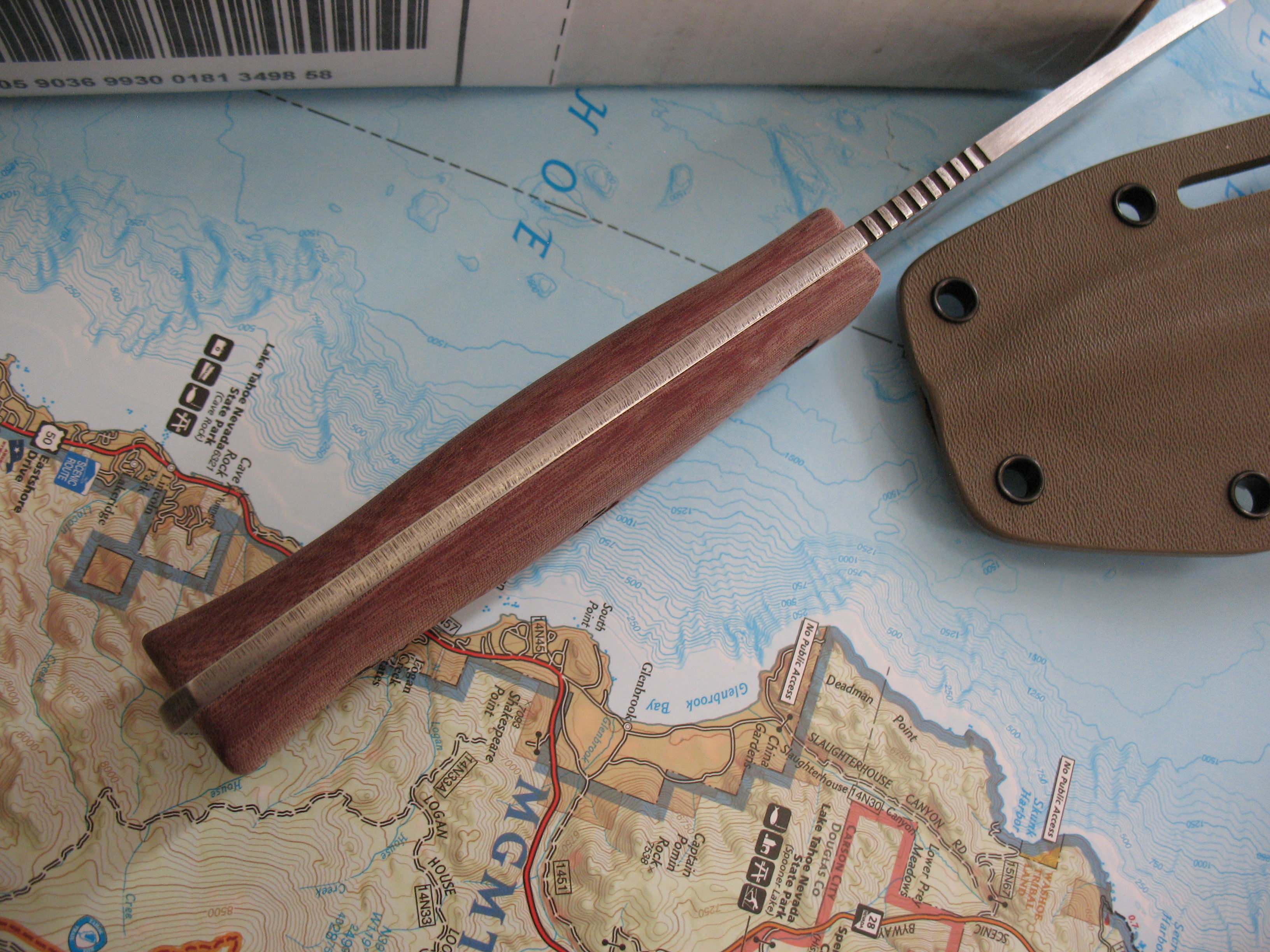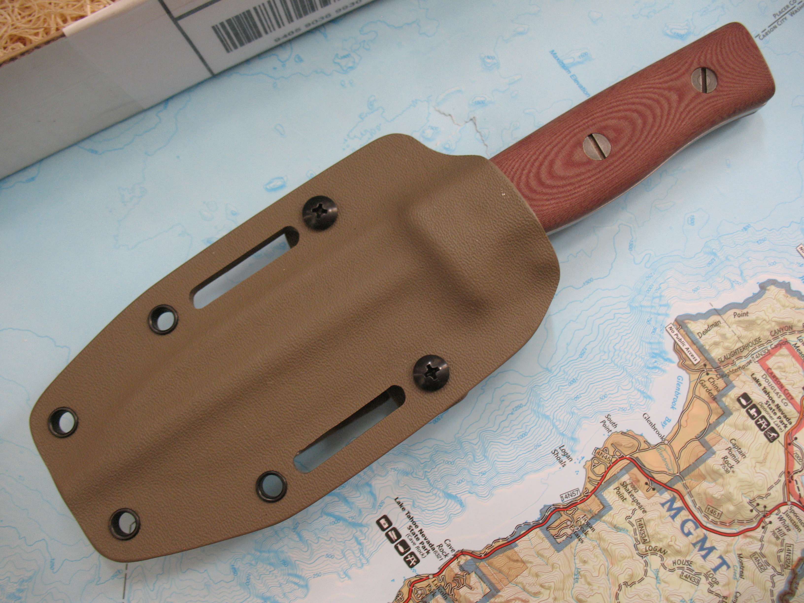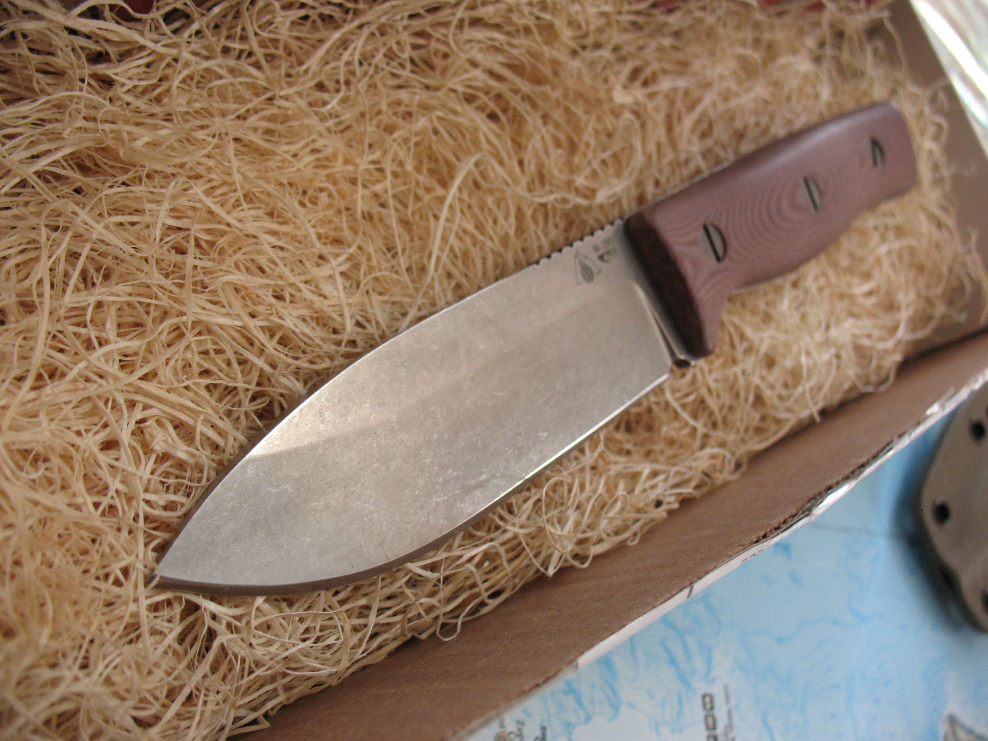 For sale is my Old Spec GSO 4.1 in M390 steel. This remains unused with the original edge. Tumbled finish shows a mark here and there as seen in the pictures. Red linen micarta handles with an FDE sheath. Box is included.