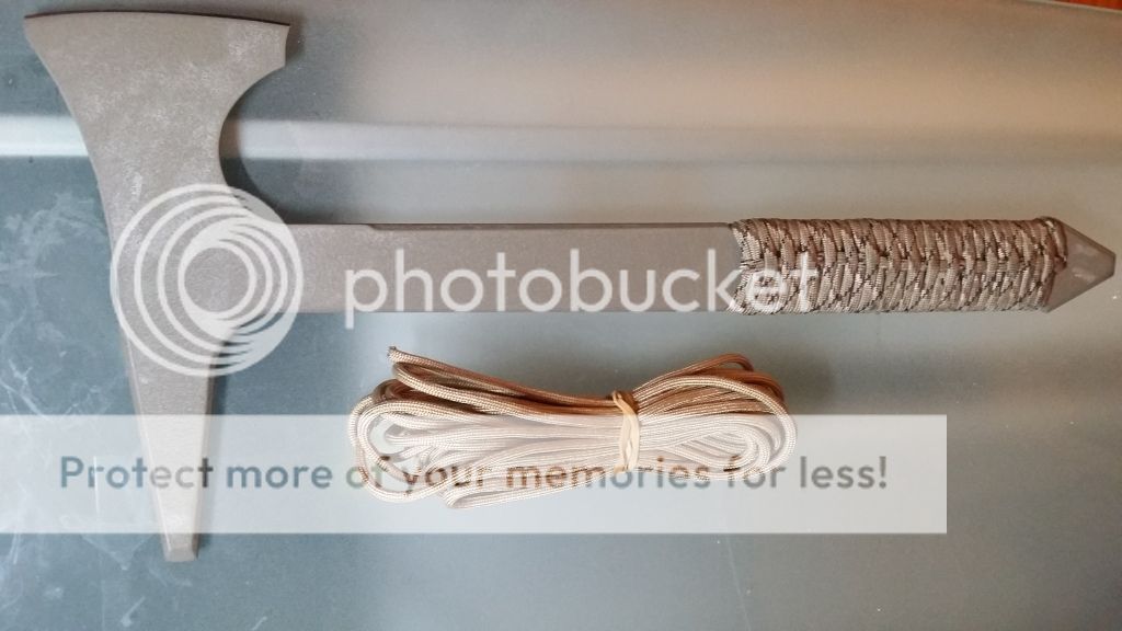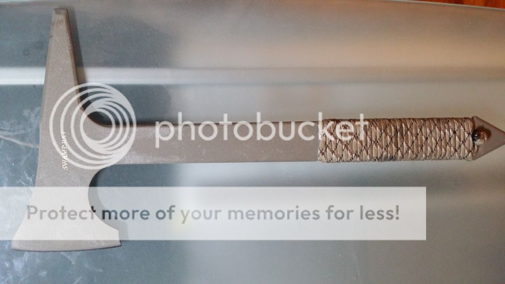 Swamp Rat Kill Devil Sniper Hawk: Used a few times, never sharpened (edge is factory). The original, unused, paracord is included with this sale. I used it on some drywall when Hurricane Sandy hit the East Coast, and there's still some white film left on the coating that may be visible in the pictures I've provided. Overall in great shape, I've only used it to chop through wood and dry wall. Included is a digi cam sheath and teck-lock, to attach to gear or belt. Factory price was $200+$40 sheath+~$10 shipping=$255. I'd like to receive $210 SPF for this tomahawk+sheath, shipped+insured USPS, with signature confirmation.