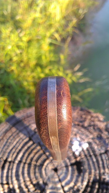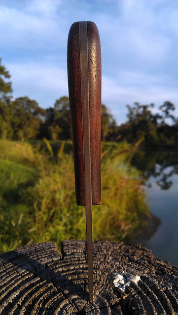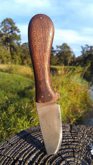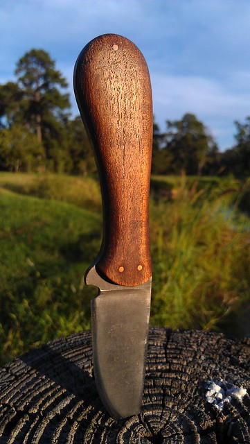 The handle is Texas mesquite, pinned with brass rods, with a mineral oil finish. When it's being carried, I keep it in a leather back pocket sheath (similar to the KSF stuff) that is also treated with mineral oil. I'm not including the sheath since it's my daily carry sheath, but you're not missing out as it's an ugly hard use thing.