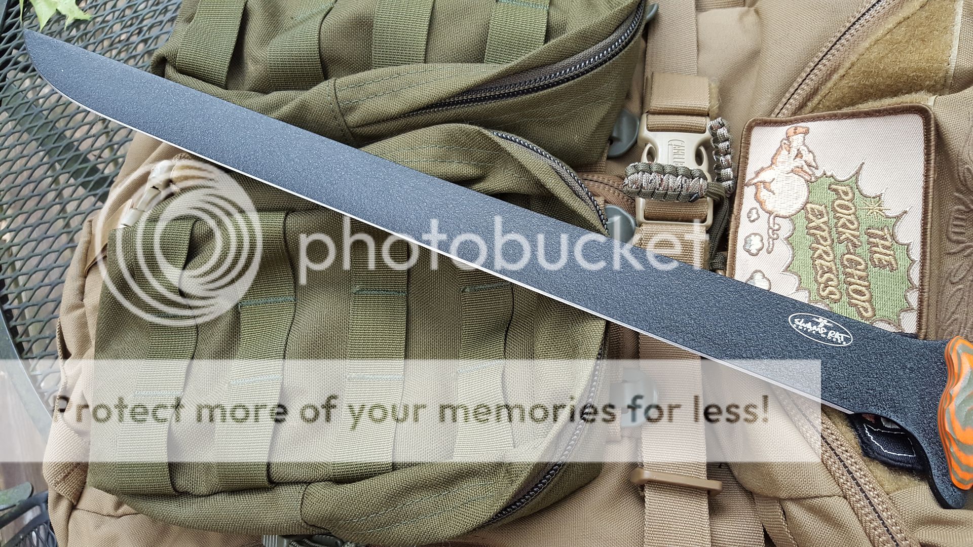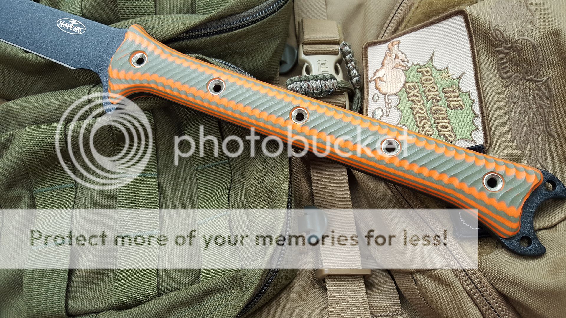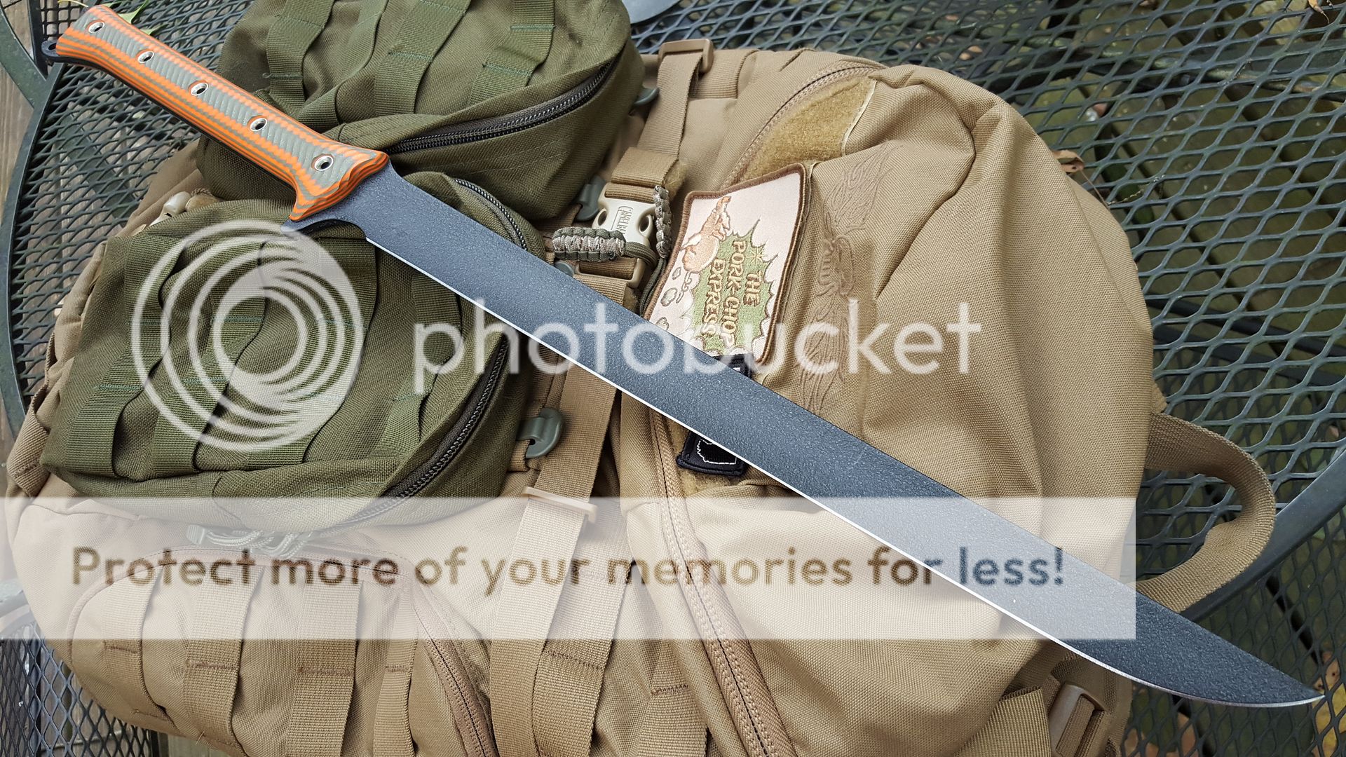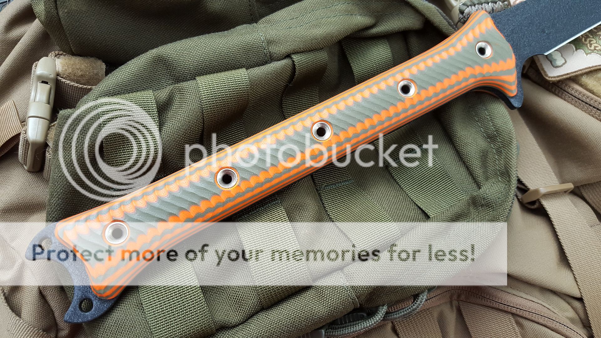 The Orange and Green G-10 scales are awesome looking on this sword. Great balance. Measuring from the top of the scales, the blade is 17" long, .176" thick. In pic #3 there appears to be a scratch on the blade, this is not the case. The way the coating dried or something from the factory, in the right light you can see like a "fish hook" pattern. You can not see it unless you tilt it and the light reflects on it.