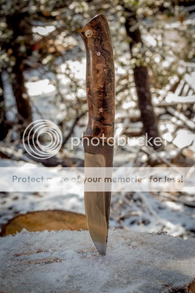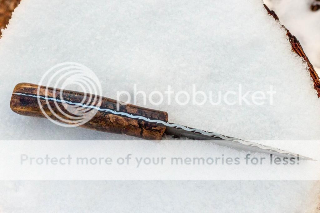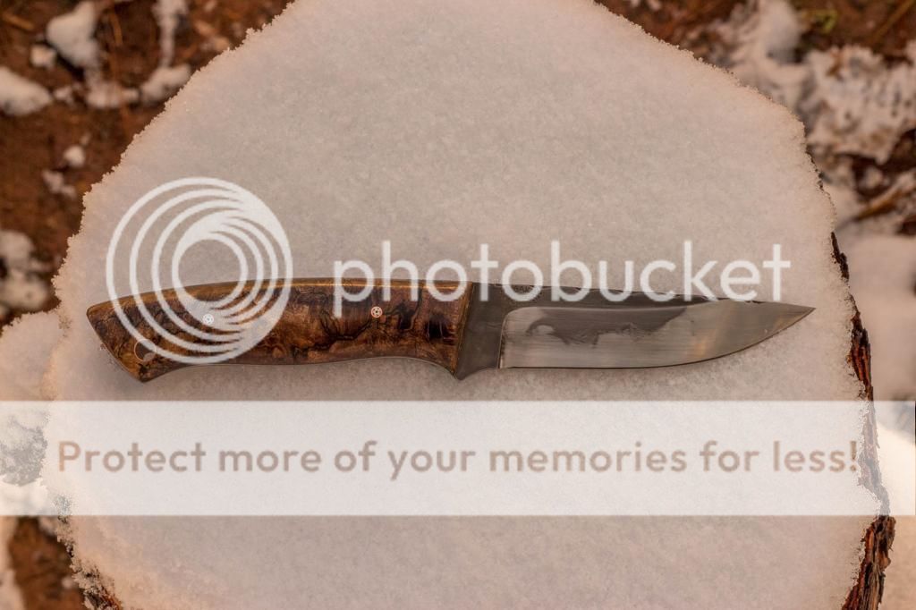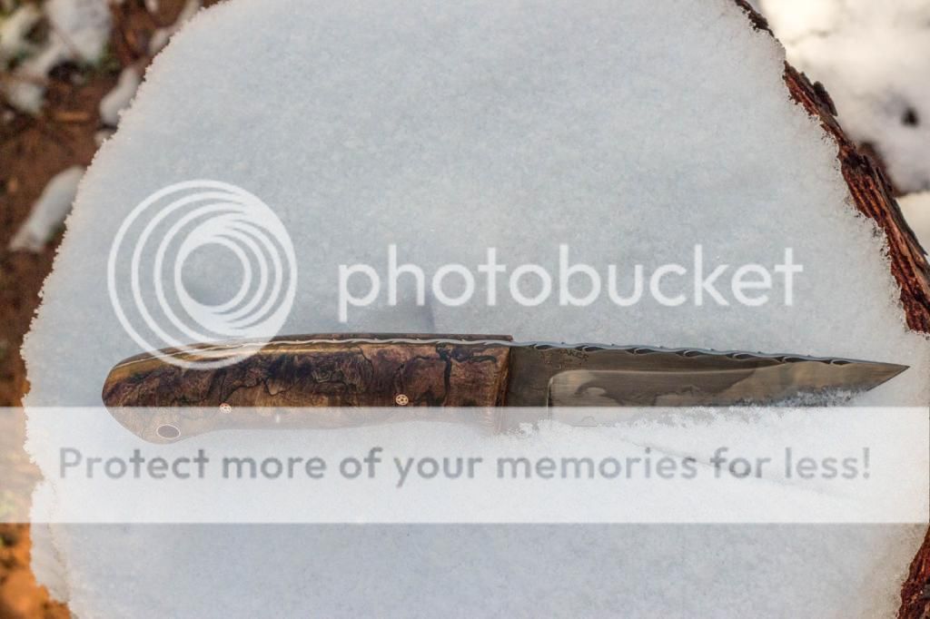 Here is a new model I have coming out. It is one of four bushcraft style knives coming out in the next couple weeks. This one features a 4" clay hardened, acid etched 1095 blade with hamon. The scales are stabilized spalted maple burl with black spacers and copper mosaic pins/tube. I also cut some proportional vine filework down the spine. Thanks for looking, Jeff
