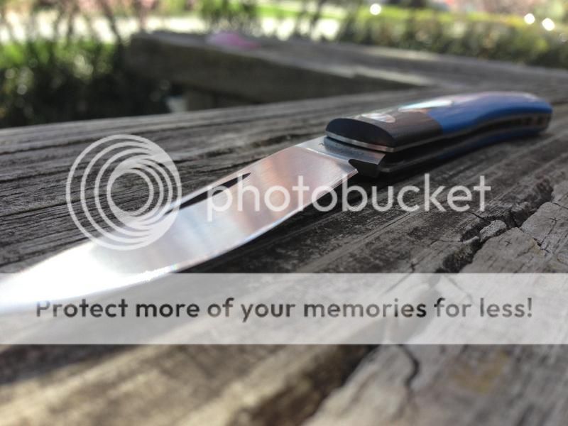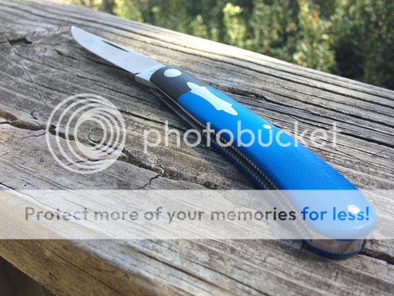 The knife has striking black & blue G10 for a modern look on a traditional slip joint. I purchased this knife directly from Todd and the knife has only been carried a few times and very lightly used to cut paper. The knife comes with the original padded zipper case provided by Todd.