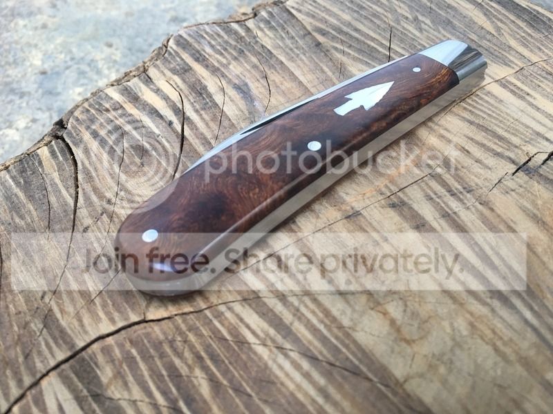 2. #736 Swayback Gent in desert ironwood. Beautiful knife with wharncliffe blade and arrowhead shield. 4 closed.