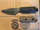 *Modder’s Special* Strider SA in S30V. There’s no beating around the bush with this one - it’s been abused. It started off as a tiger stripe model. I sandblasted it and then gave it a black oxide finish. Then I chipped the tip and gave it a rough regrind to get it back to functional. It’s thick and ugly but I can’t think of a better knife to pry open car doors with, except maybe the tanto version. Comes with poo brown and black MEFP scales. Also the sheath has been cut to make it more pocket friendly.