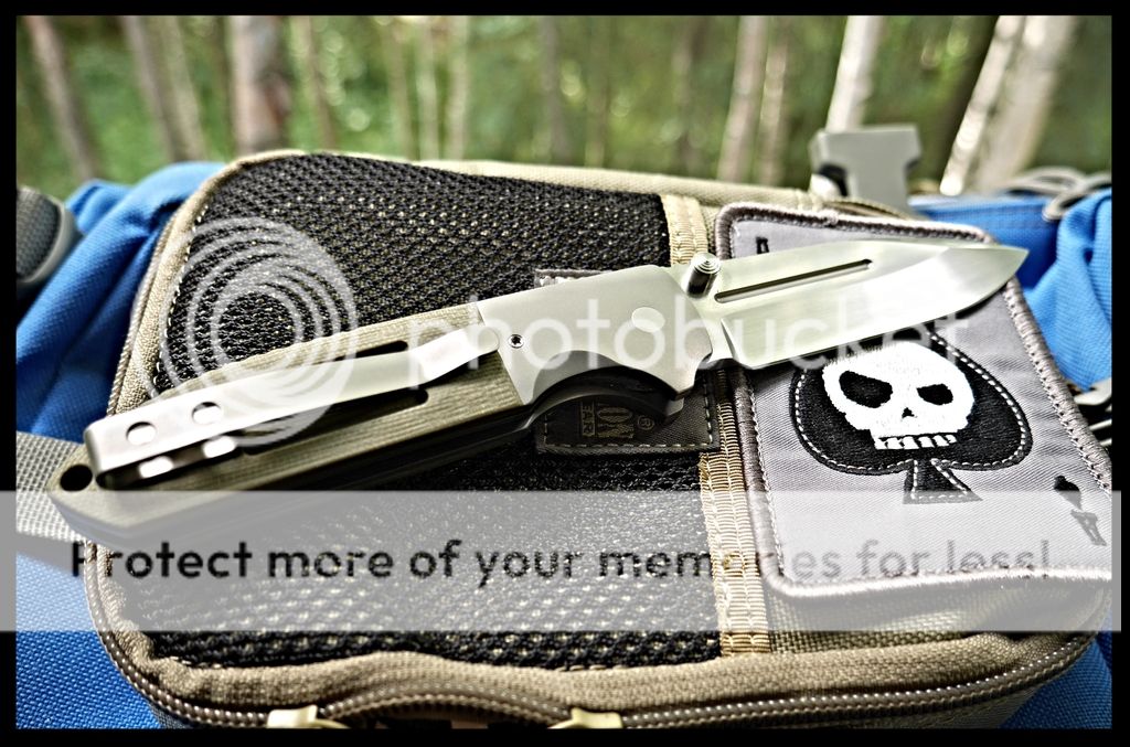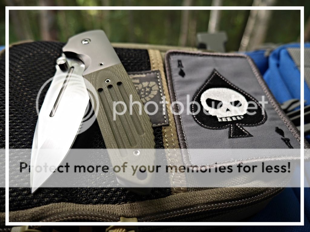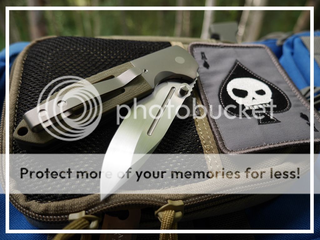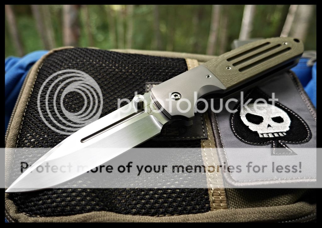 Features a drop point satin finished blade with dual thumbstuds and a notched thumbrest. The handle has bead blasted titanium bolsters, green G-10 scales, bead blast titanium liners and tip up titanium clip. Perfect lockup, detent, and blade seating.