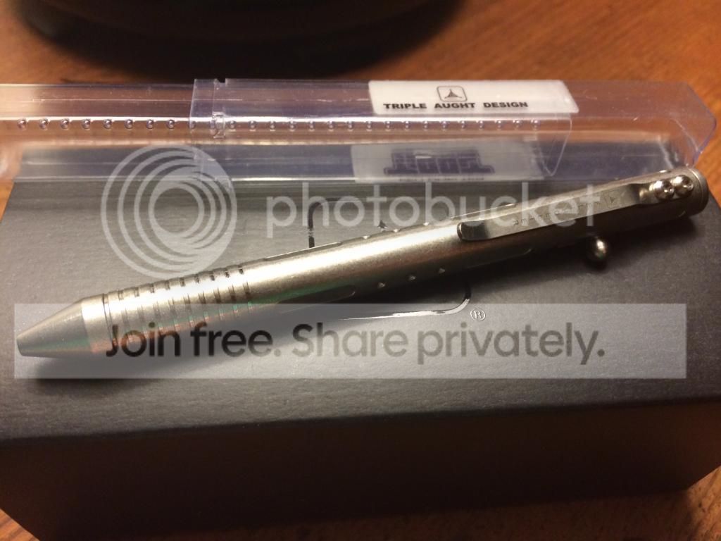 TAD TiBolt pen in excellent condition. I bought a couple of months ago and carried only a few times. When I received it from TAD there were a few faint scratches on the "FE" of Fellhoelter, and said that they would take it back, but I would have to wait to get another one, and I passed it since it is a pen and will get used. It comes with TAD inner/outer box and the plastic sleeve. Asking $150 shipped in CONUS with PP Gift. Please email watchknut AT hotmail DOT com for quickest response.