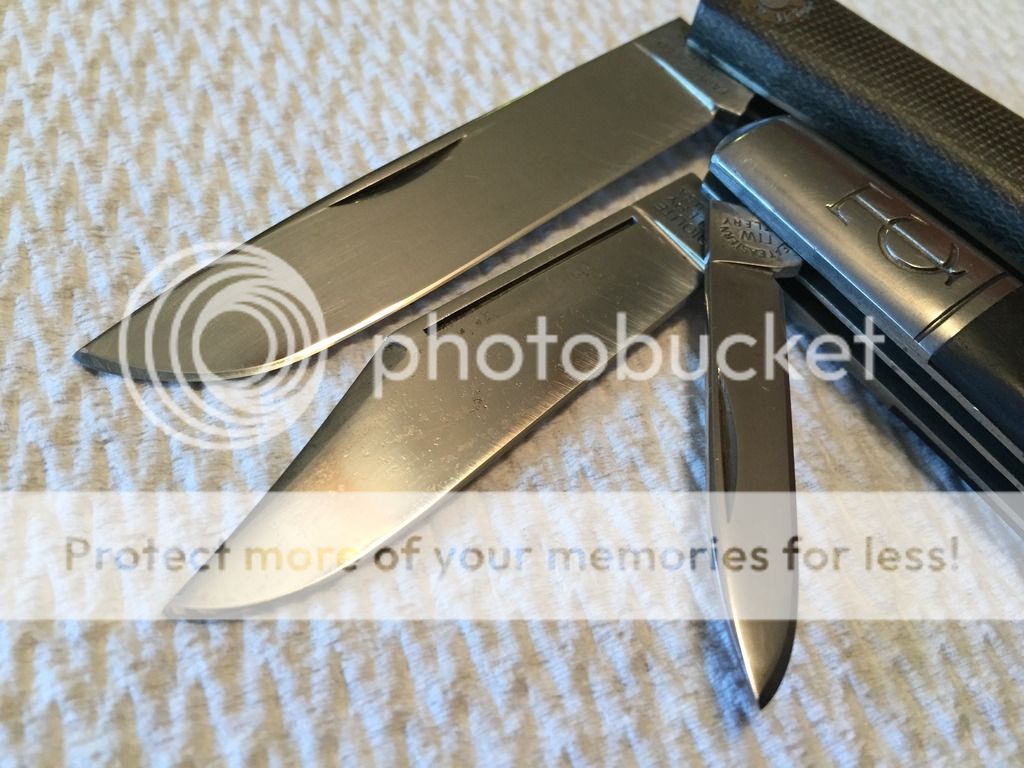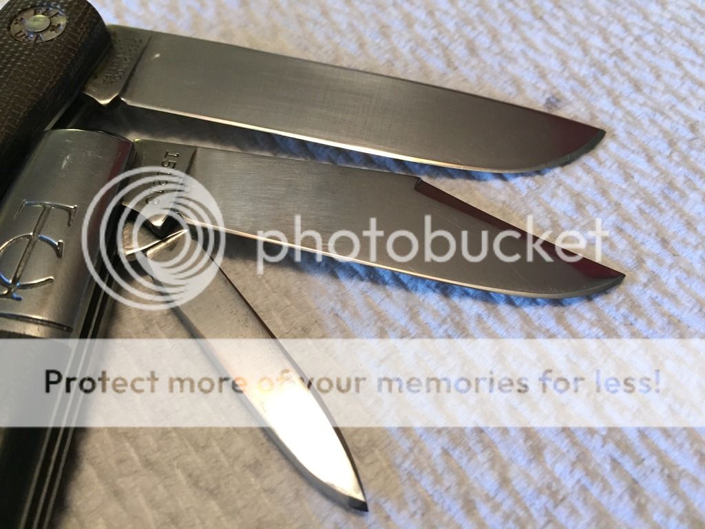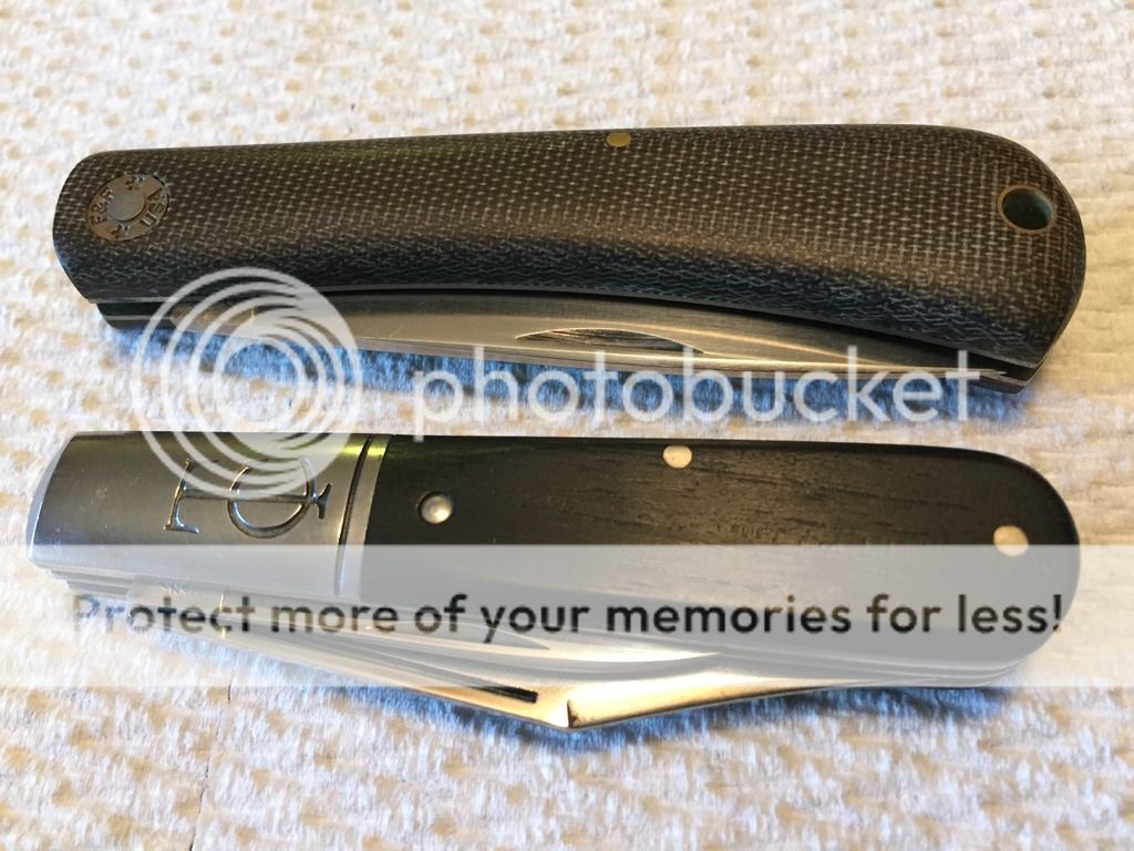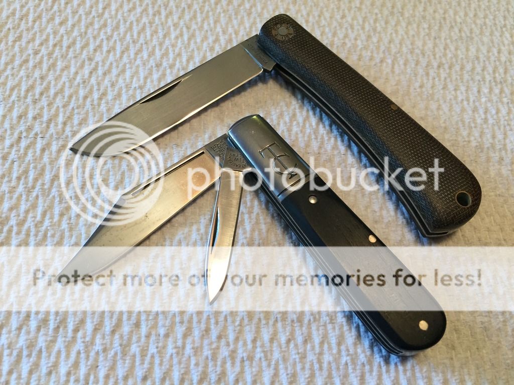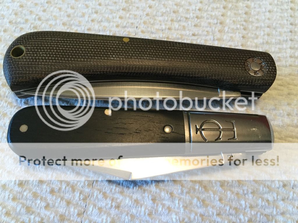 GEC TC 151213 Clip long pull main & pen secondary in Ebony. This was a user, carried, sharpened, etc for the past 2 years. When I received it about 10 months ago it had patina and some rust on the blades. I carried it as is for a few months and then cleaned the blades and bolsters up. The knife was sent to ApostleP to professionally sharpen both blades and he did an excellent job. Hard to capture in photos but the blades/bolsters have tiny spots (pitting) from removed patina/rust. The knife functions smooth and flawlessly. Perfect walk/talk, centering, and springs flush in all 3 positions on both blades. This one has a TON of life left and you won't be afraid to carry her! As many of you know I'm rather harsh on my descriptions & im sure the buyer will be extremely happy with this TC! Tube included.