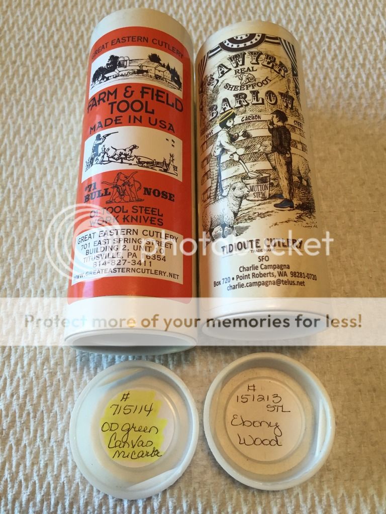 GEC Bullnose 715114 OD Green Canvas Micarta O1. Here's a variant you don't see often with the rather limited OD Canvas Micarta & the favorable O1 steel. Nice user, carried, sharpened blade scratches etc. Solid with no blade play. Centering favors left but doesn't rub. This was sent to ApostleP for a sharpening and he did an excellent job. Tube included.