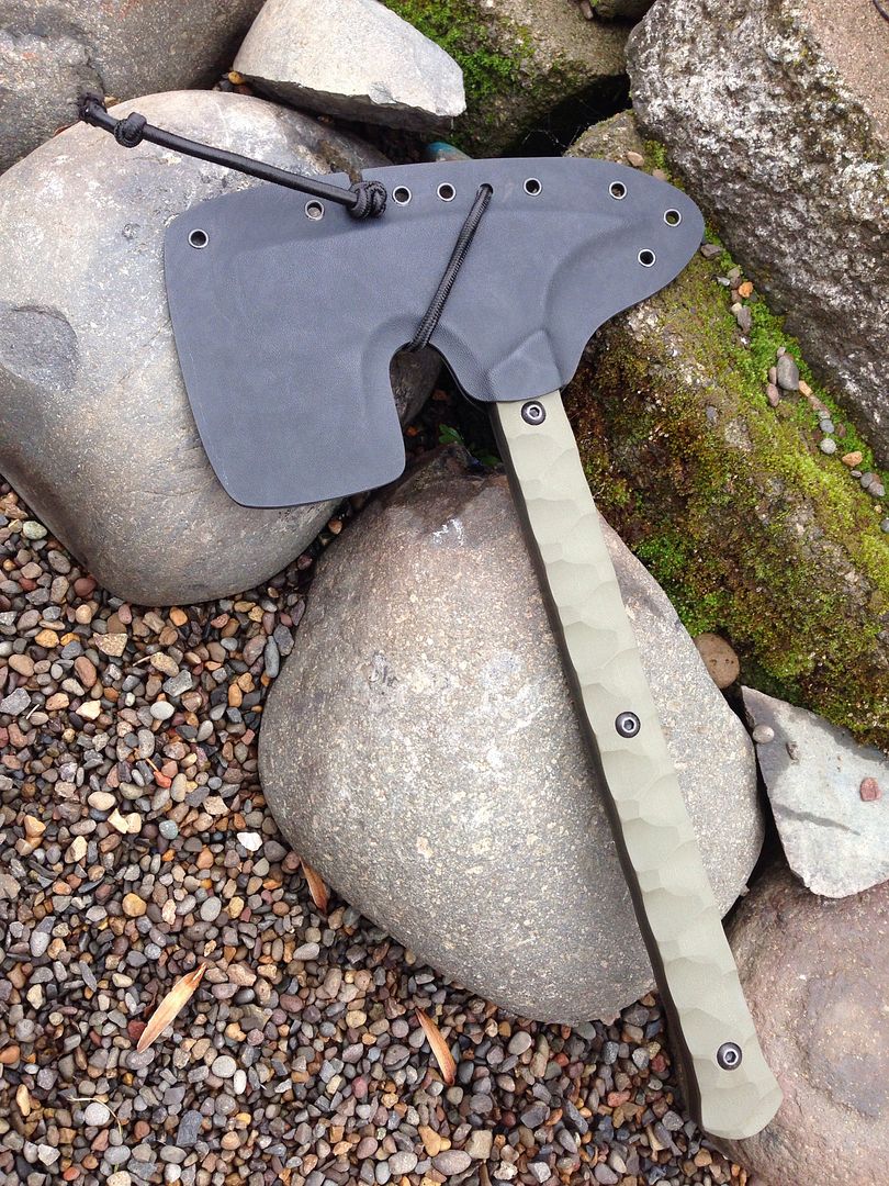 Sheath - Kydex with bungi retention system. This locks the axe in the sheath, but is very quick to release for use.