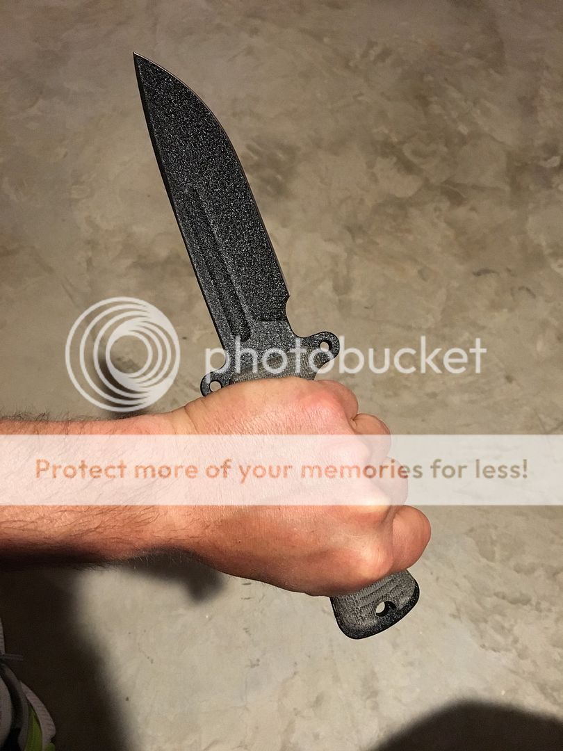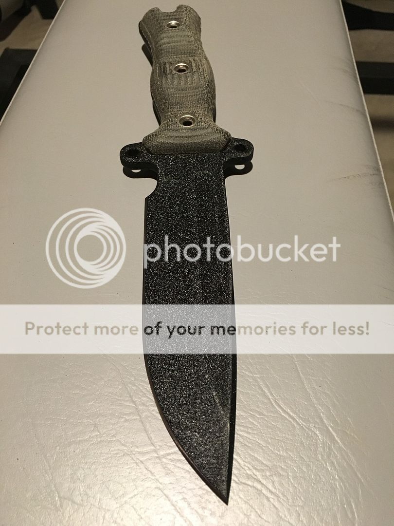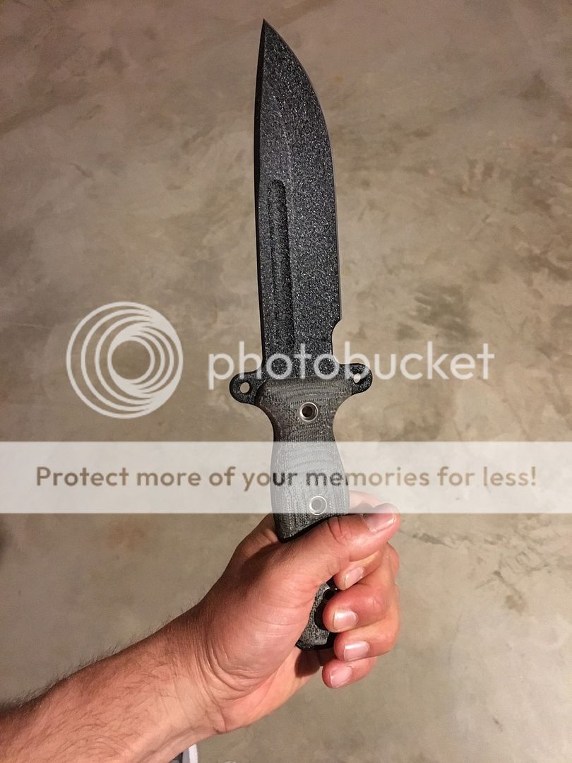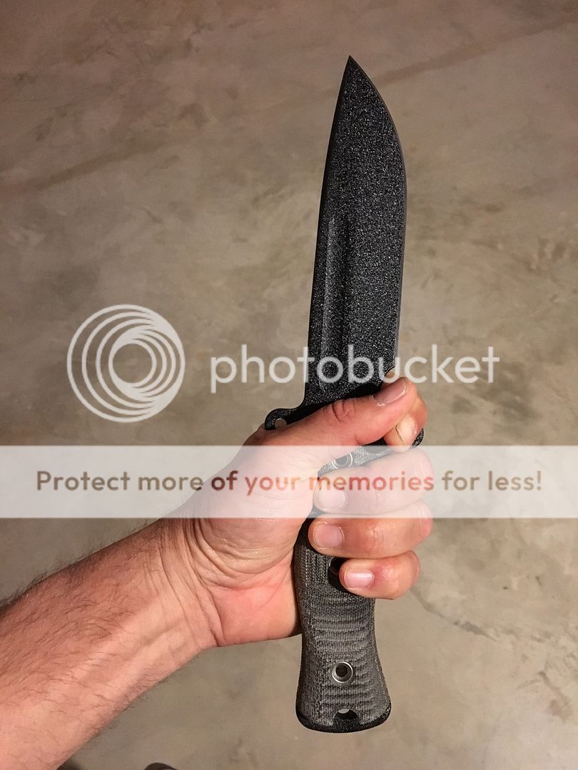 The handle contours felt odd the first time I held it. The more I fondle the more it feels right. Still not 100% but I gotta put it through some work for a truely fair assessment. There aint nothing mini about this beast. At some point I may smooth out the micarta and strip her. Gotta make or buy a sheath too. Im thinging a Specops Combat Master short might be just right for it. On to the pics...