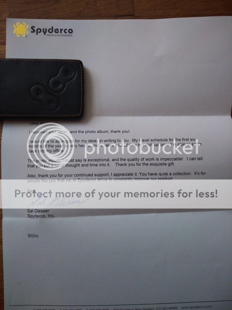 I would like share with you this precious Moment. One year before, I decide to make a Photo Album of a part of my Spyderco Collection and decide to make a second to send to Sal Glesser and to Spyderco Crew. Yesterday, when I came from the Work, I see a Letter on my Desk with a beautiful Golden Bug on it. And when I opening this, I was really happy. So again I would like tell Thanks you Sal and all People working for Spyderco and of course all Fans like me