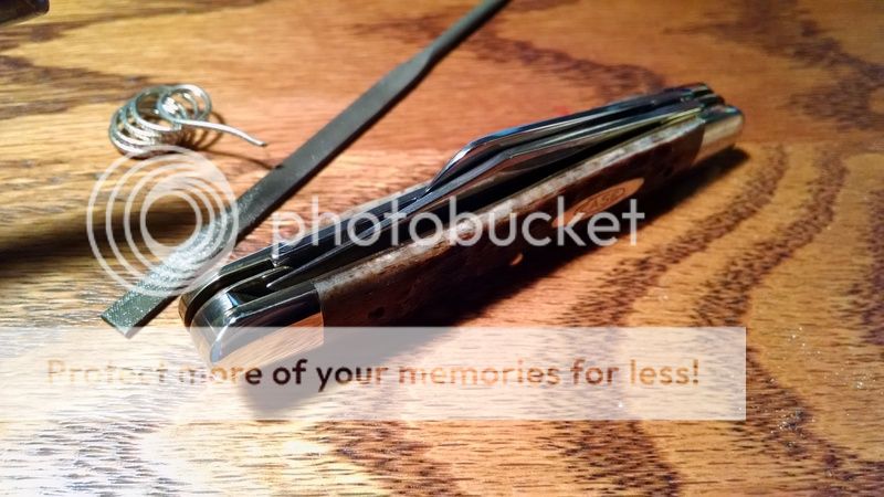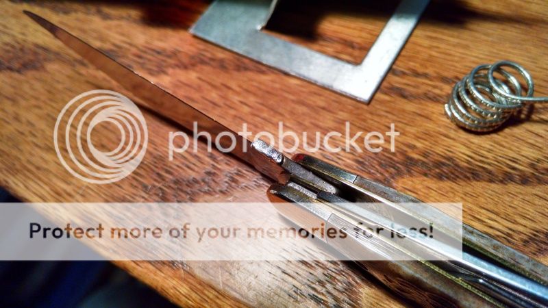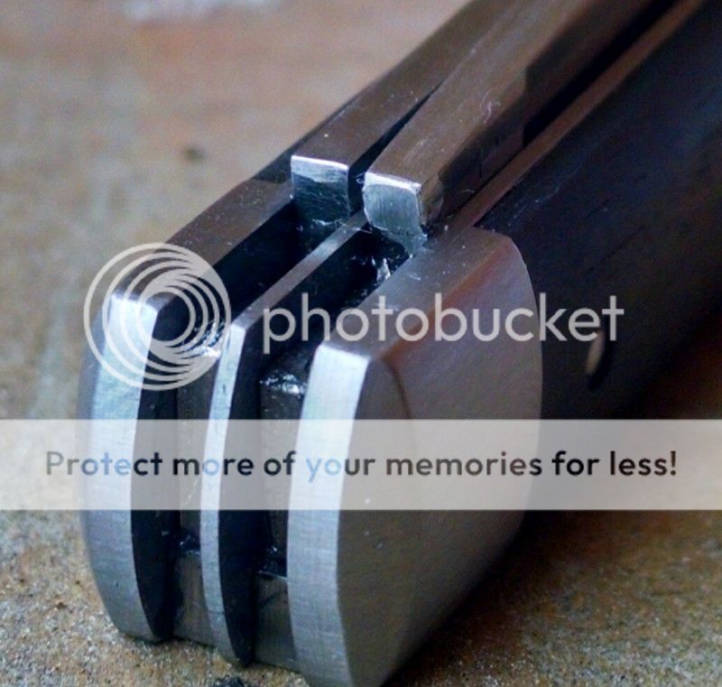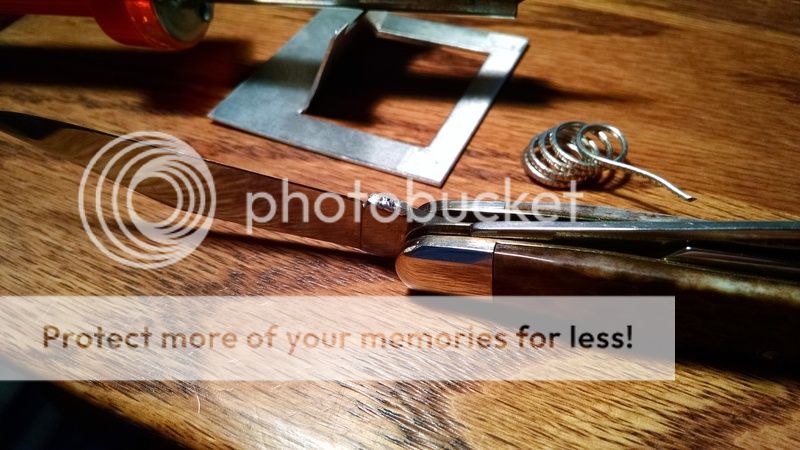 It came a couple days ago and was near perfect: except the main blade kick was ground so low that the first 1/4" of the tip was what stopped the blade, the knife faced a future of a permanently dull tip. I got that sinking feeling... then remembered I had a warm house, working car, and a 4 day weekend... All is well! I hemmed and hawed this weekend and decided to try soldering direct to the steel. My expectations were that I'd burn myself and have the solder roll off the tang and burn a hole in the carpet...