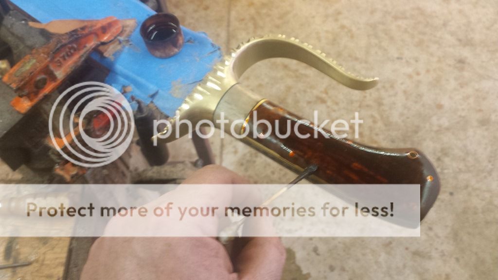 Time to get back to the knife... I start staining the wood now. This process is a little more involved as well than one pic. Truth is, I will/did stain this and sand it many times. Kinda like doing body work on a car. The stain will show all of your high and low spots. So you sand and stain until they are all gone. That way, you end up with dare I say, perfection. I didn't count, but if I was a guessing man, I'd say I stained, sanded, polished, repeat about eight times.