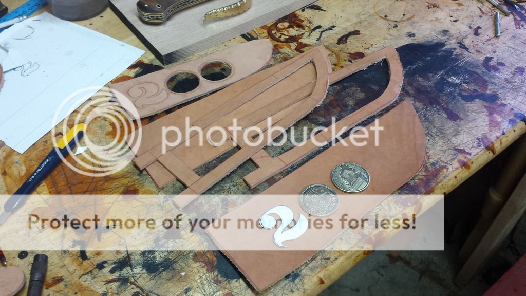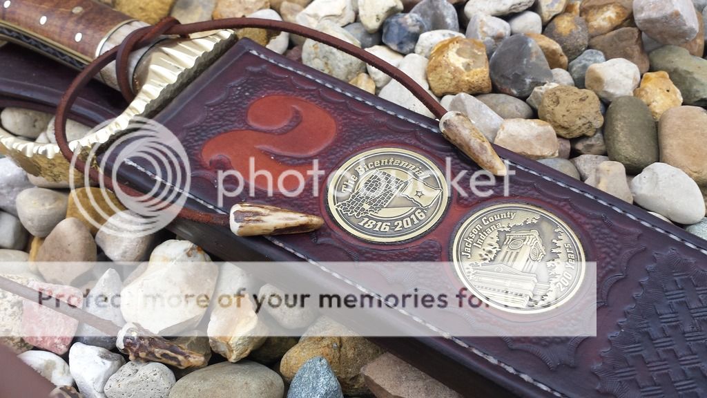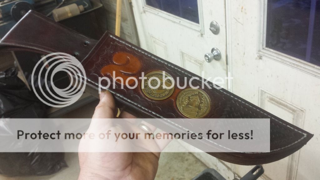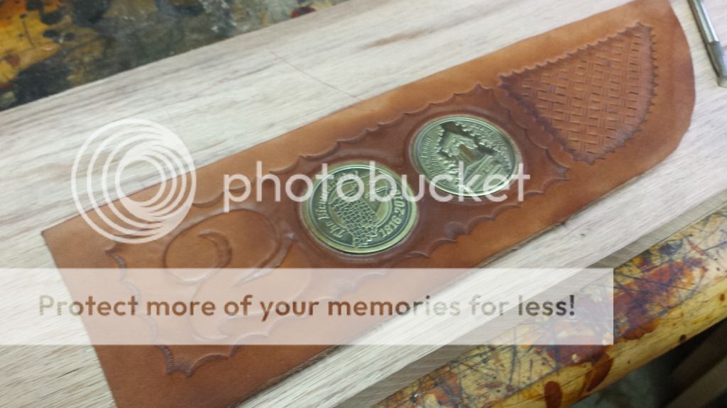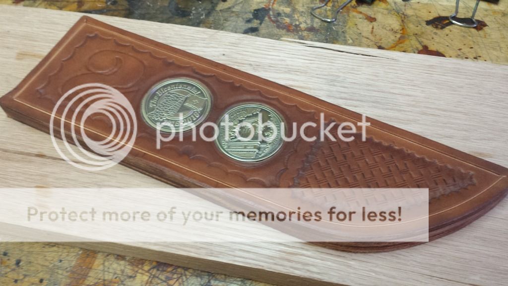 There was a lot more to the sheath than just the few pics, but basically, I was provided a couple of bicentennial commemorative coins to use in the project, so, I inlayed them into the work, hand tooled a 2 that matched the 2 on the $20. bill (youll see later) and had to hand sew the leather. All of the layers made it to thick for my sewing machine, so back to old school manual labor!