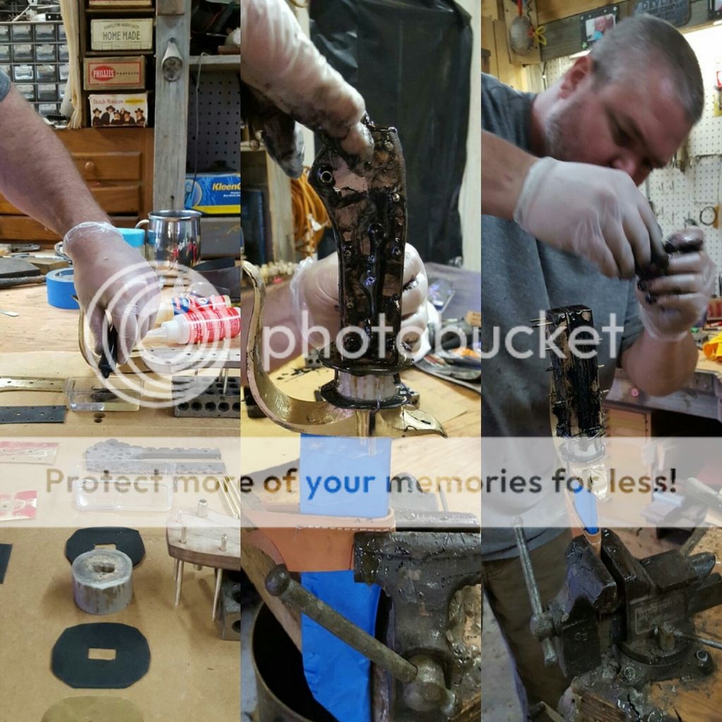 Now for the actual assembly. This is a stressful time. Everything has to go together flawlessly for the fit and finish to come out right. I know it may not look like it, but there is over 25 individual hand crafted pieces that make up this handle that have to be assembled in less than 5 minutes. Thats the time it takes for the epoxy resisn to set. If its not done in that time, your pretty much cutting it apart and starting over. I dyed the resin black in this case to form a back filled in the file work. (You'll see more on that coming up)