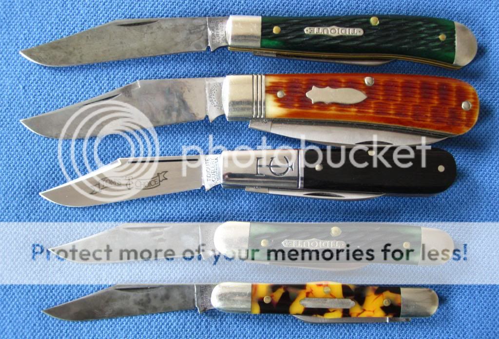 It might be silly to put so much thought into the aesthetics of the blade's shape, but it's interesting to me, how much these factors can change my perception of the knife. The trapper and peanut seem fragile and needle-like (muskrat and toothpick blades even more so, but I don't have any of those), where the Buck on the right seems almost comically blunt even though, if you look carefully, it's got a narrower point than a lot of the blades in the middle of the picture.