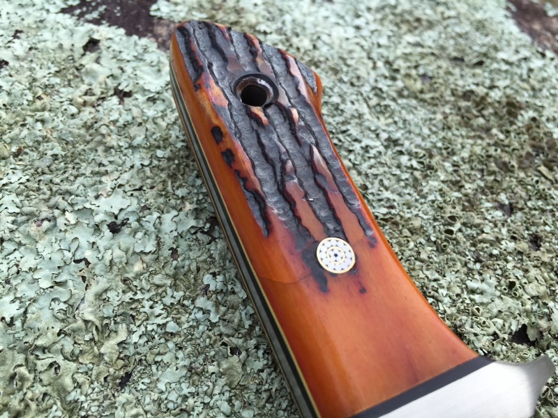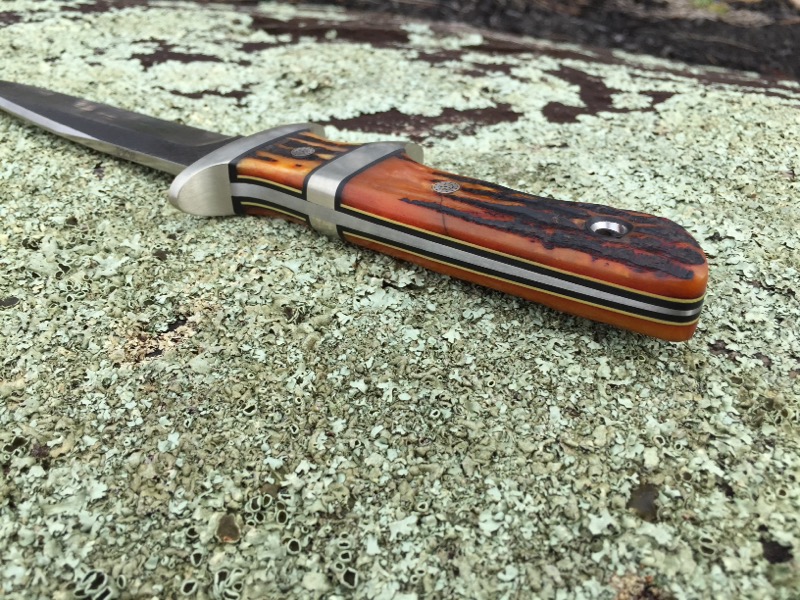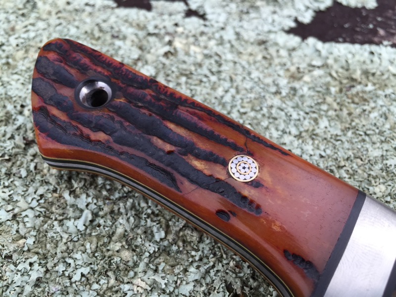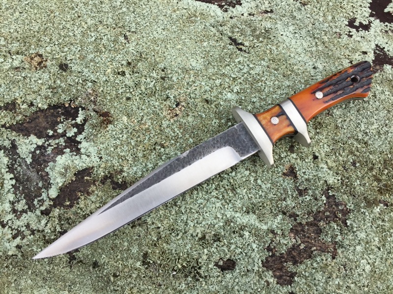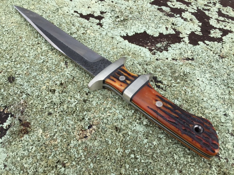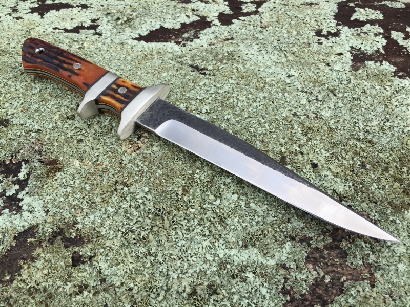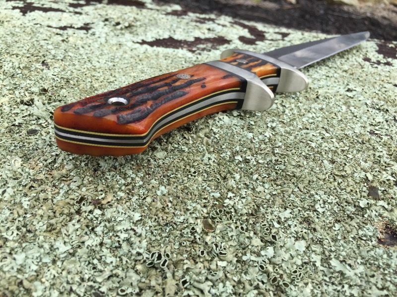 This is the second of the large sub-hilts that I have ever made, its a real beauty. OAL 12 ½ with a 7 ½ blade. Nickel silver guards with bone stag scales over black liners with yellow pinstripe. Mosaics on 5/32 cpm154 tapered tang.