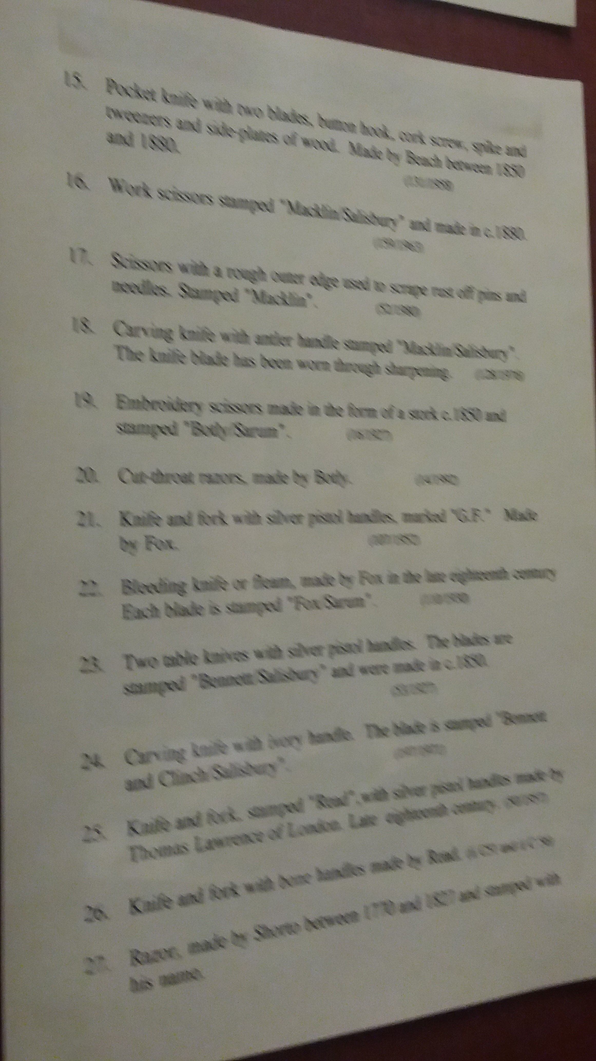 There are no surviving records of the early cutler's marks for knives actually produced in Salisbury until at least the late 17th century, but they became more identifiable at the beginning of the 18th century, when actual words began to be incorporated into marks, including 'SARUM' for Salisbury.
