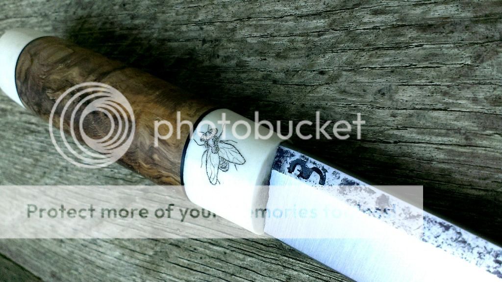 Handle is oak burl and reindeer antler with small scrimshaw.