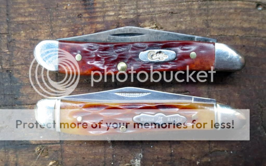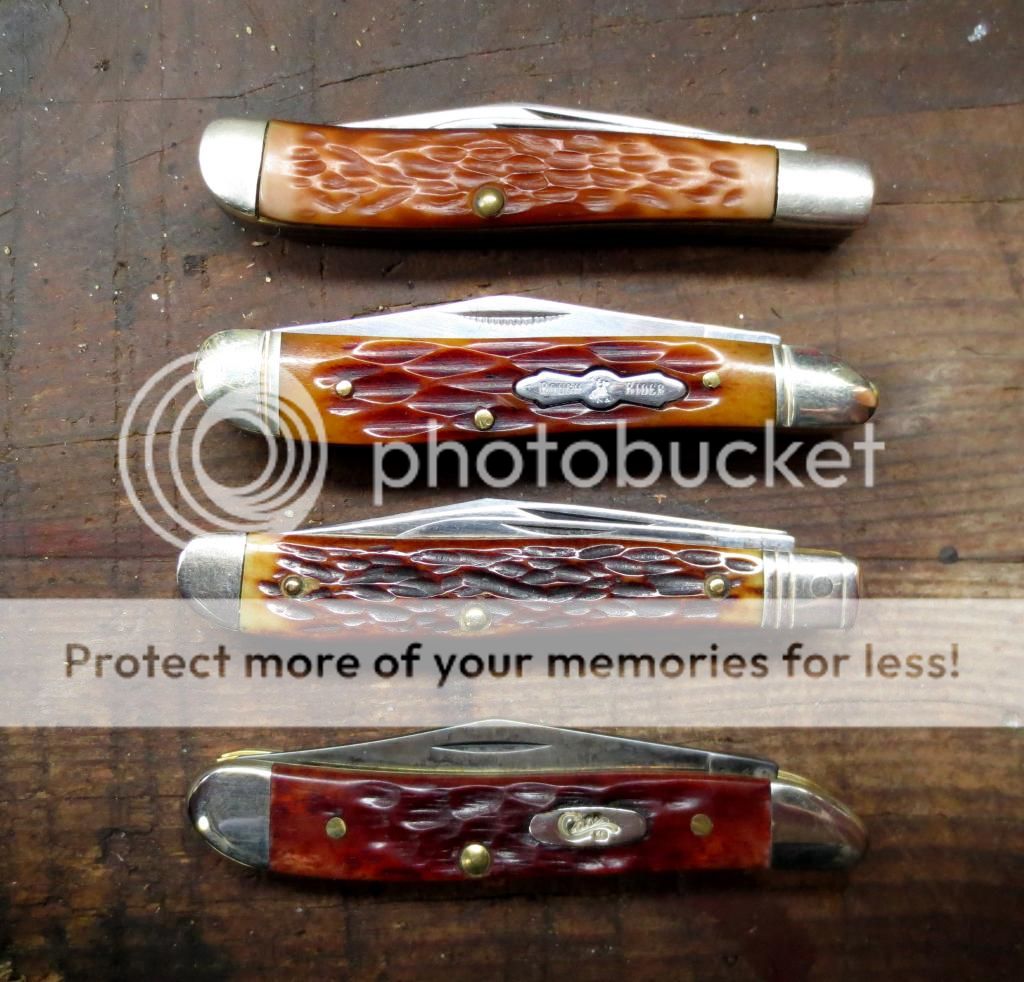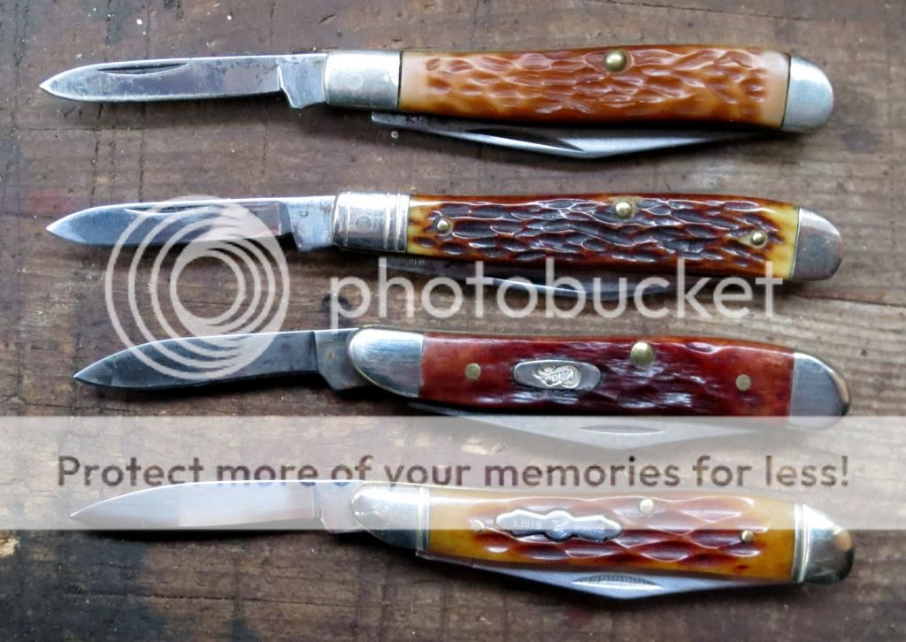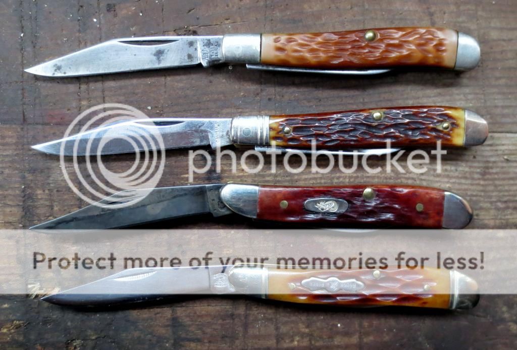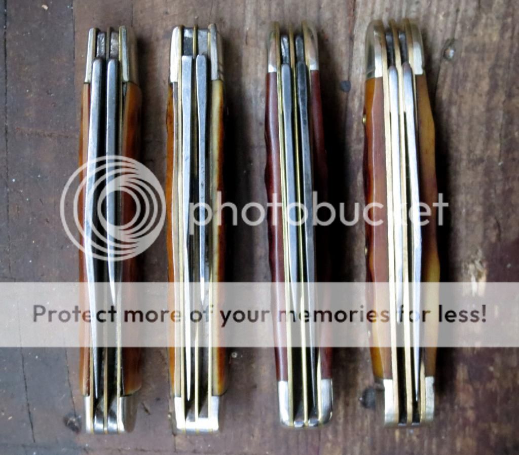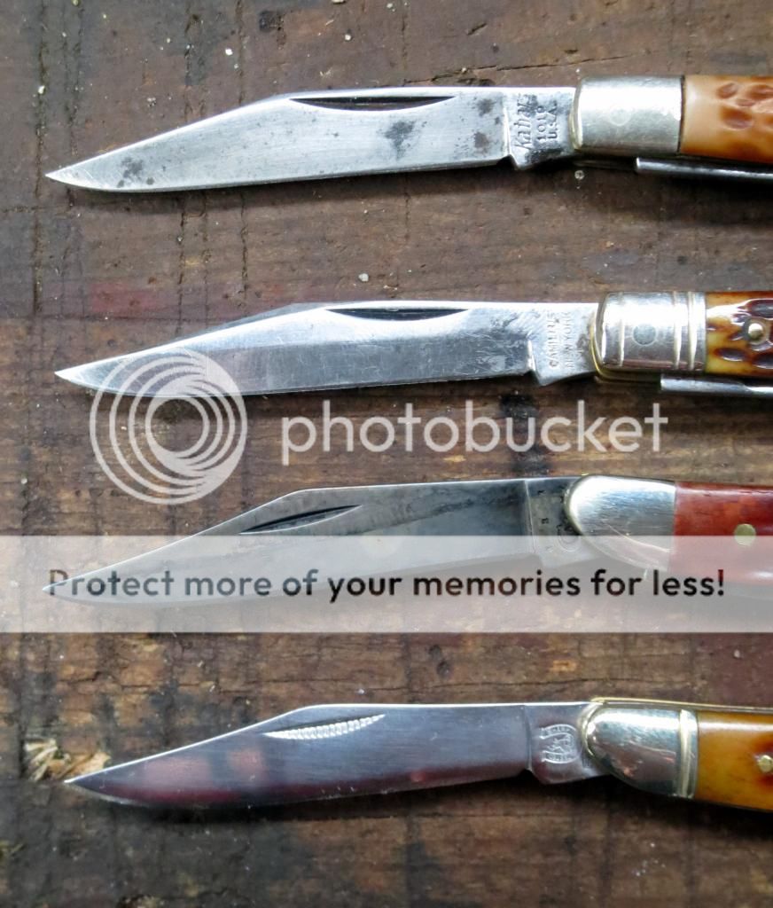 Main blade opened, and ordered in a specific way, you'll read why... Top to bottom: Kabar, Camillus, Case & Rough Rider.