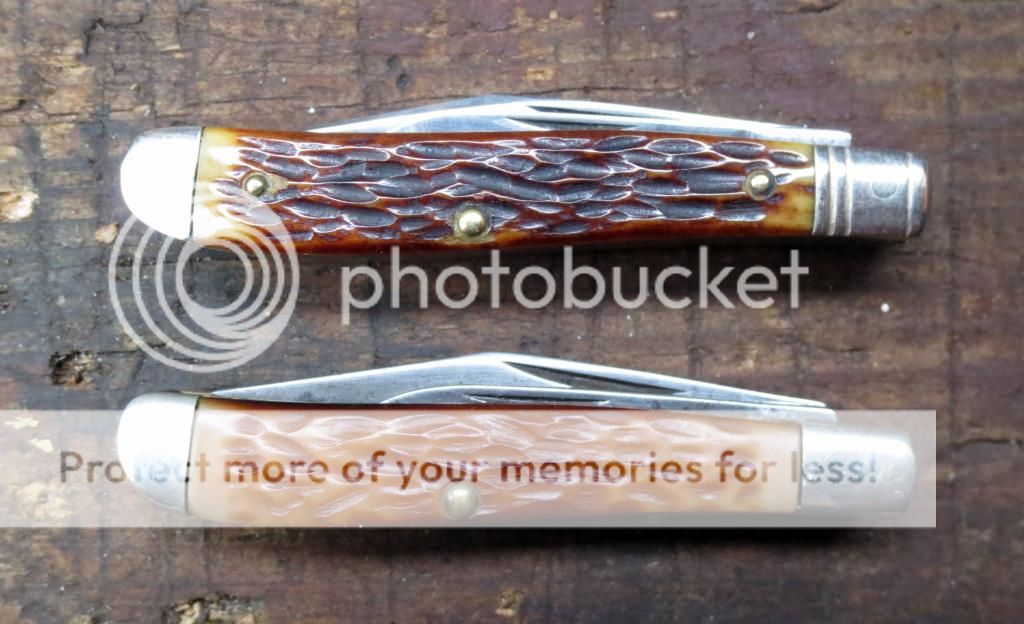 The bone on the RR is very well done. I'd like the Case peanut to be a bit more darker though. But that's personal preference. What the next shot definitely shows is that the pins on the RR are not very well peened. Or maybe not even peened at all. The f&f on the Case with regards to the pins is definitely better, but overall both are really good and pretty close to one another. If only the RR would have carbon steel blades...