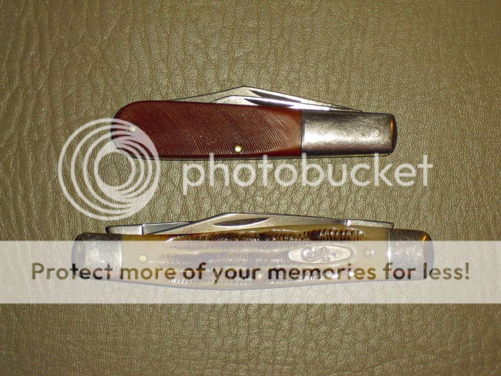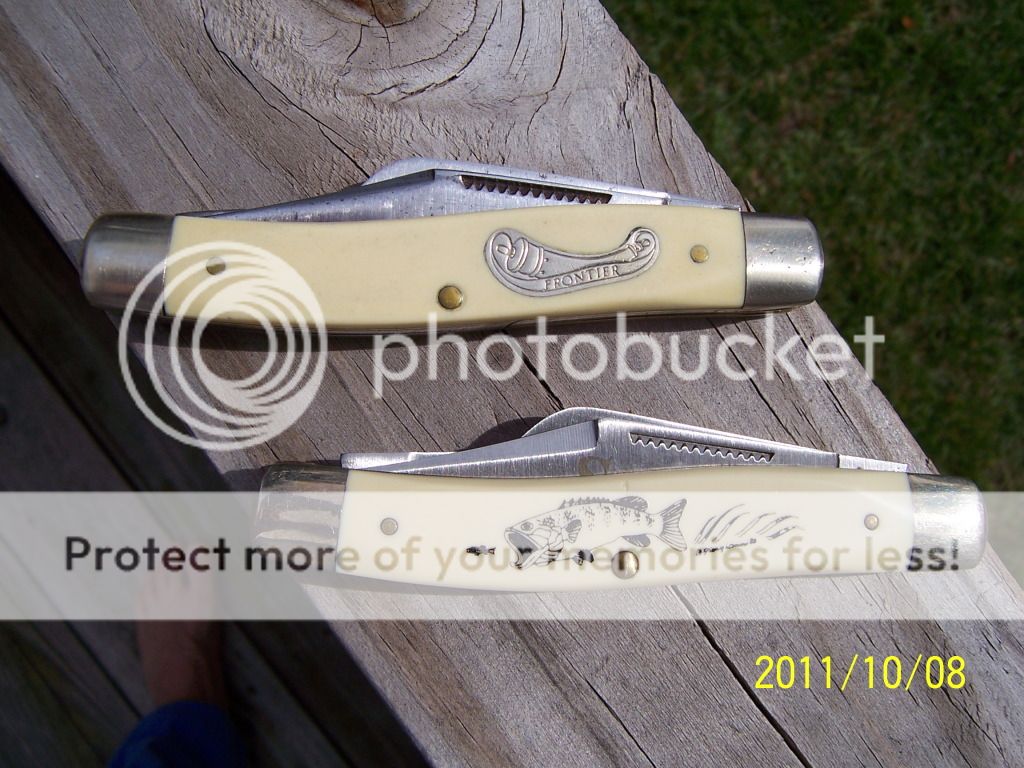 The fact that Delrin takes and holds dyes so well made the material a good substitute for celluloid handles of ad specialty knives also. A heated die was pressed onto the handle over a dye tape, scoring the handle and filling the impression with dye. In 1975, the resident Schrade artist, a very talented man by the name of Frank Giogianni, bored with the commercial art he created for packaging, logos, and commercial ad knives, presented Henry Baer for his consideration a cream Delrin handled scrimshaw knife of his own design. Baer enthusiastically approved and the commercial art became creative decorative art and the popular Scrimshaw series was born."