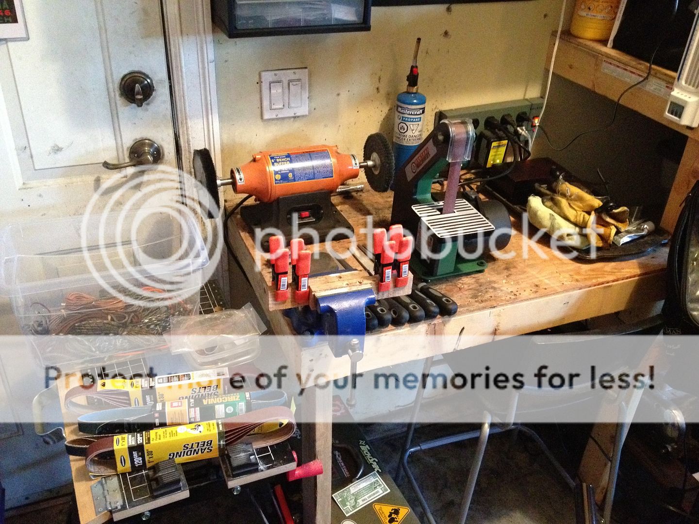 So now comes the important stuff. Most of this will be hand filed and worked. My "grinder" is an 4-1/4" angle grinder held in a vise (don't laugh, it gets worse). I don't own a really decent set of files, so if you have a favorite brand, I'm all ears. I'm thinking a tanto type grind, single sided, but don't really have a clue how to achieve that...