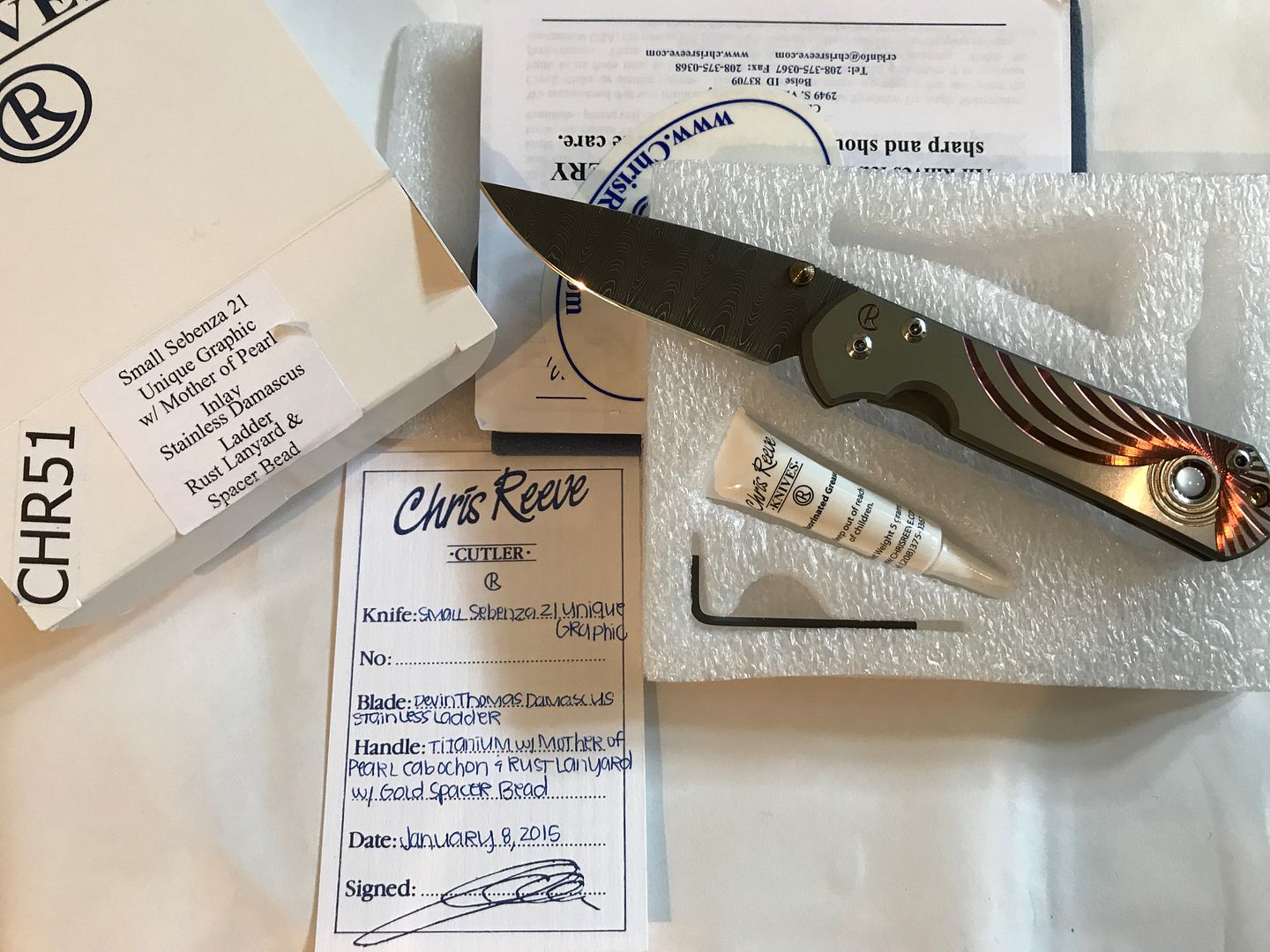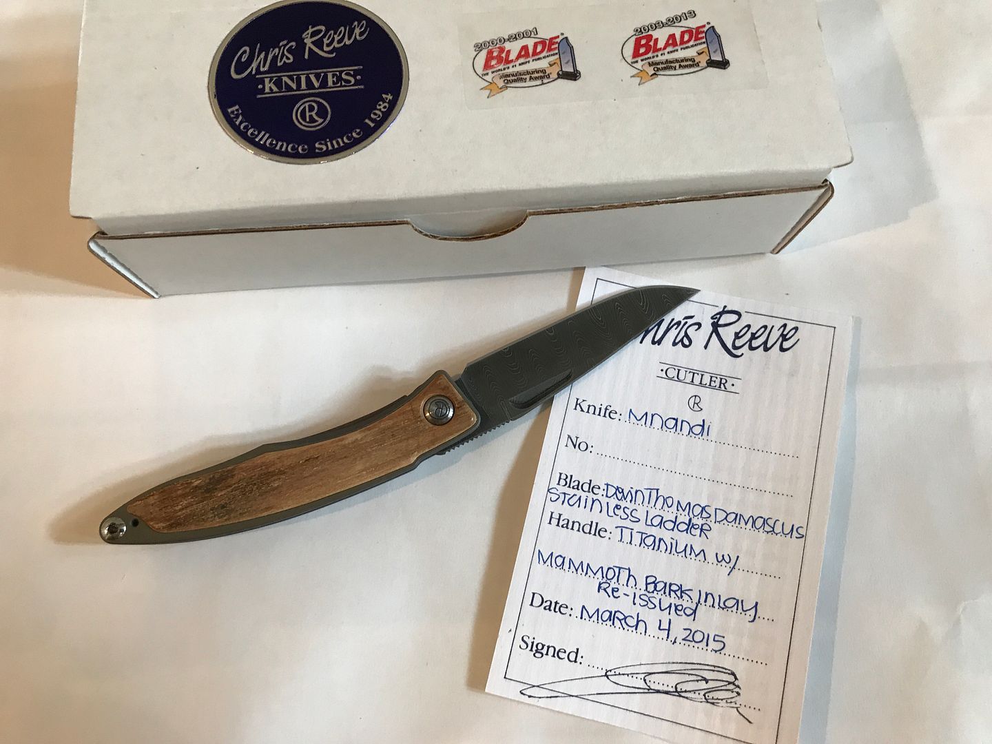 And Last is my 1/20 Prototype Umnumzaan. This knife is a perfect safe queen. No blemishes. It comes with the original birthday card, box, and cloth. The knife also comes with original Chris Reeves Umnumzaan Disassembly/Reassembly tools, with instruction pamphlet. ($Sold)