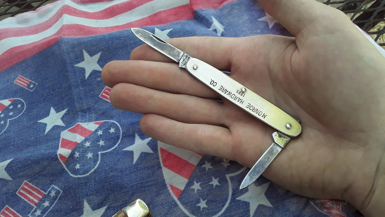 I've been spending more time fishing these days, seeking out a shady place in the banks of the San Gabriel river, dealing with the bait, cleaning fish, some work in the backyard garden. It seems that many times a day I'm using a knife for something, if only to trim of bit of chicken liver for the hook, cut some jute twine for the pepper and tomato plants, or opening the packages those Amazon vans leave at the front door. In the months after my knee replacement, I went from 182 pounds to 170 pounds, and Karen likes the new slimmer me, so she has me on a diet. I think all the working out in rehab did me good. So the pocket knife does stealth duty on the occasional secret commando strike, slicing off a bit of cheese from that block to Tillimook cheddar in the fridge.